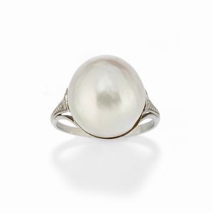 in platino, Peso g 4,70 misura 12 al centro una perla coltivata mabé di mm 13,00 circa e ai lati due diamanti [..]