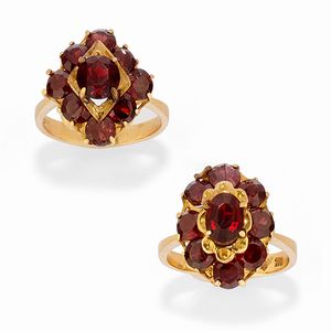 in oro giallo 18k, Peso g 11,30 misura 14 con sommità ovale e a losanga, granati di forma rotonda e ovale.