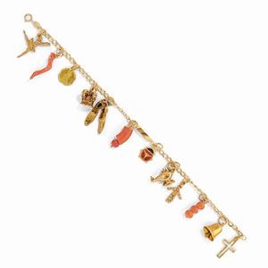 in oro giallo 18k, Peso g 9,90 cm 17,50 maglia ad anelli con dodici pendenti di varie forme e raffigurazioni in [..]
