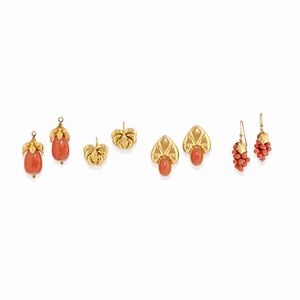 uno in oro giallo 14k e gli altri 18k, Peso g 18,80 misure 10-12-13-14-15 decorati con coralli taglio ovale cabochon, [..]