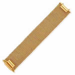 in oro giallo 18k, Peso g 61,00 cm 3,30x19,50 1950 circa maglia a tessuto con centrale a fibbia.