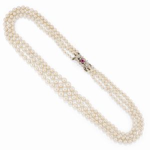 in oro bianco 18k, Peso g 81,00 cm 51,00 realizzata a tre fili di perle coltivate Giappone disposte a degradè [..]