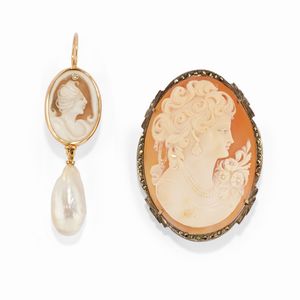 in argento e oro rosso 18k, Peso g 22,70 cm 4,50x5,80-6,50 realizzati su conchiglia raffiguranti profilo femminile, [..]