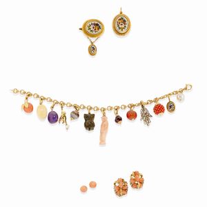 in oro bassa caratura e argento, Peso g 38,00 cm 7,00-5,00-3,00 di varie forme e raffigurazioni, differenti decori, [..]