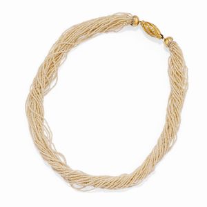 in oro giallo 18k, Peso g 32,60 cm 41,00 realizzata a venticinque fili di micro perle con chiusura impreziosita [..]
