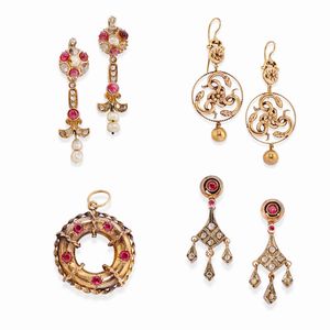 in oro giallo 18k, Peso g 23,15 cm 1,00x3,80-2,00x3,00-1,80x2,00-1,50x3,30 due coppie di orecchini con inserti [..]