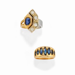 in oro rosso e bianco 18k, Peso g 13,10 misure 9-10 1940 circa uno a fascia con zaffiri taglio marquise, l'altro [..]