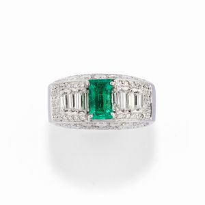 in oro bianco 18k, Peso g 12,60 misura 12 a fascia con al centro smeraldo taglio rettangolare di ct 0,50 circa, [..]