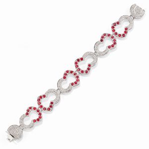 in oro bianco 18k, Peso g 53,80 cm 2,00x18,00 di forma stilizzata con rubini taglio rotondo per totale ct 5,00 [..]