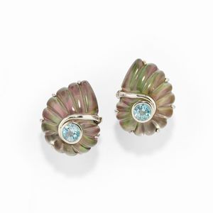 in oro bianco 18k, Peso g 25,80 cm 2,20x2,60 realizzati a conchiglia, con al centro topazi azzurri taglio rotondo, [..]
