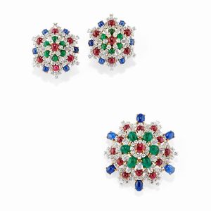 in oro giallo 18k e platino, Peso g 70,50 cm 5,00-3,50 composta da spilla e coppia di orecchini con chiusura a [..]