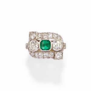 in platino, Peso g 5,75 misura 10 al centro smeraldo taglio rettangolare a contorno ottagonale di ct 1,13 (caratura [..]