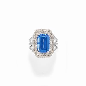 in oro bianco 14k, Peso g 7,58 misura 14 al centro tanzanite taglio rettangolare a contorno ottagonale di ct 8,22 [..]