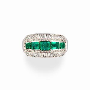 in platino, Peso g 11,00 misura 15 montatura bombata, al centro smeraldi taglio rettangolare a contorno ottagonale [..]