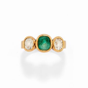in oro giallo 18k, Peso g 6,48 misura 13 al centro smeraldo taglio cuscino, ai lati due diamanti taglio vecchio [..]