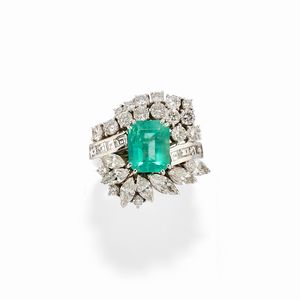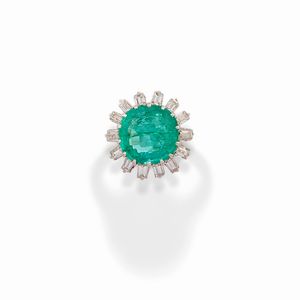 in oro bianco 18k, Peso g 22,80 misura 15 al centro smeraldo Colombia di ct 16,52 (caratura incisa), diamanti [..]