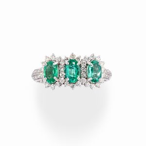 in oro bianco 18k, Peso g 3,70 misura 15 al centro smeraldi taglio ovale per totale ct 1,50 circa e diamanti taglio [..]