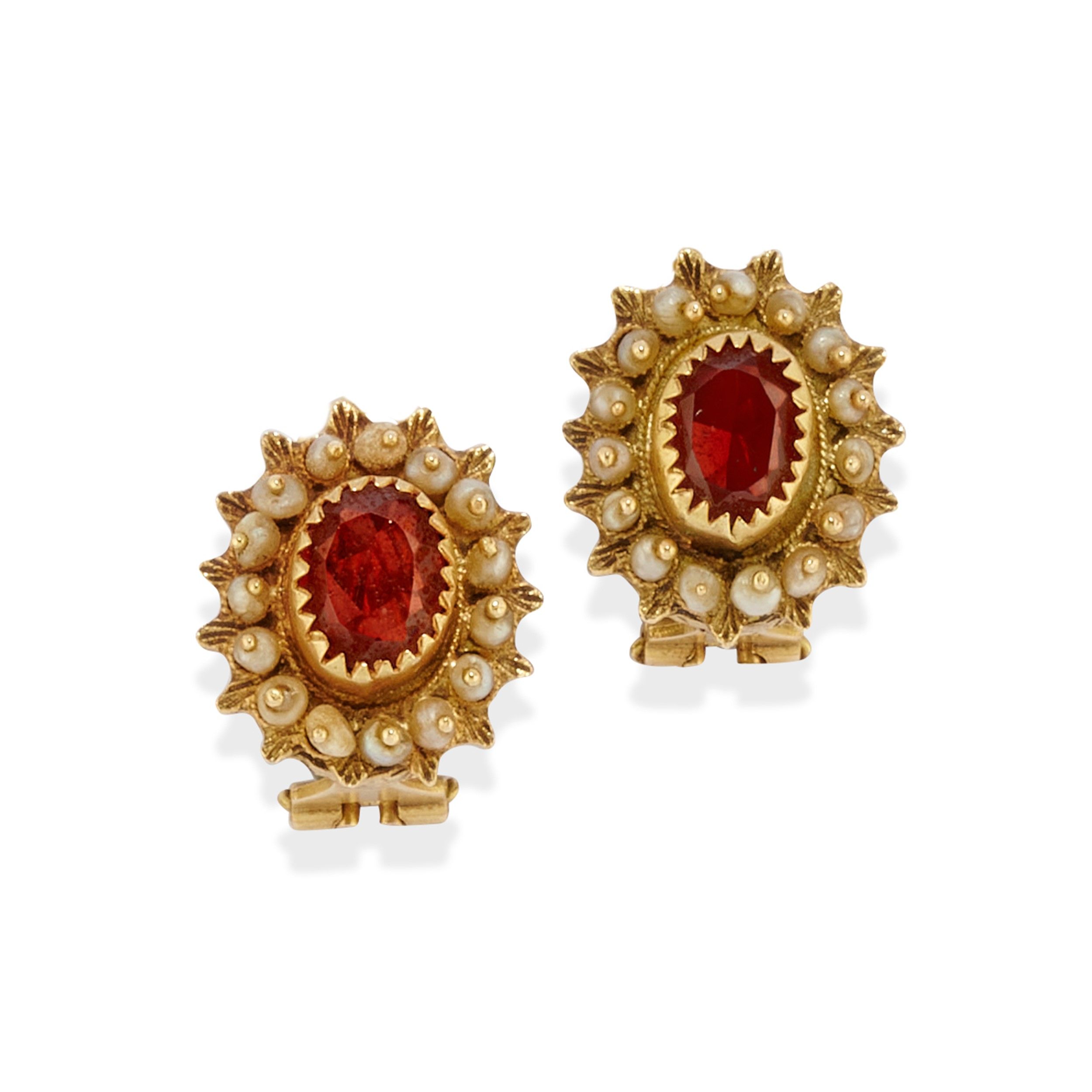 composto da spilla con cammeo, bracciale a cancello e coppia di orecchini con granati e microperle, chiusura perno e clip.