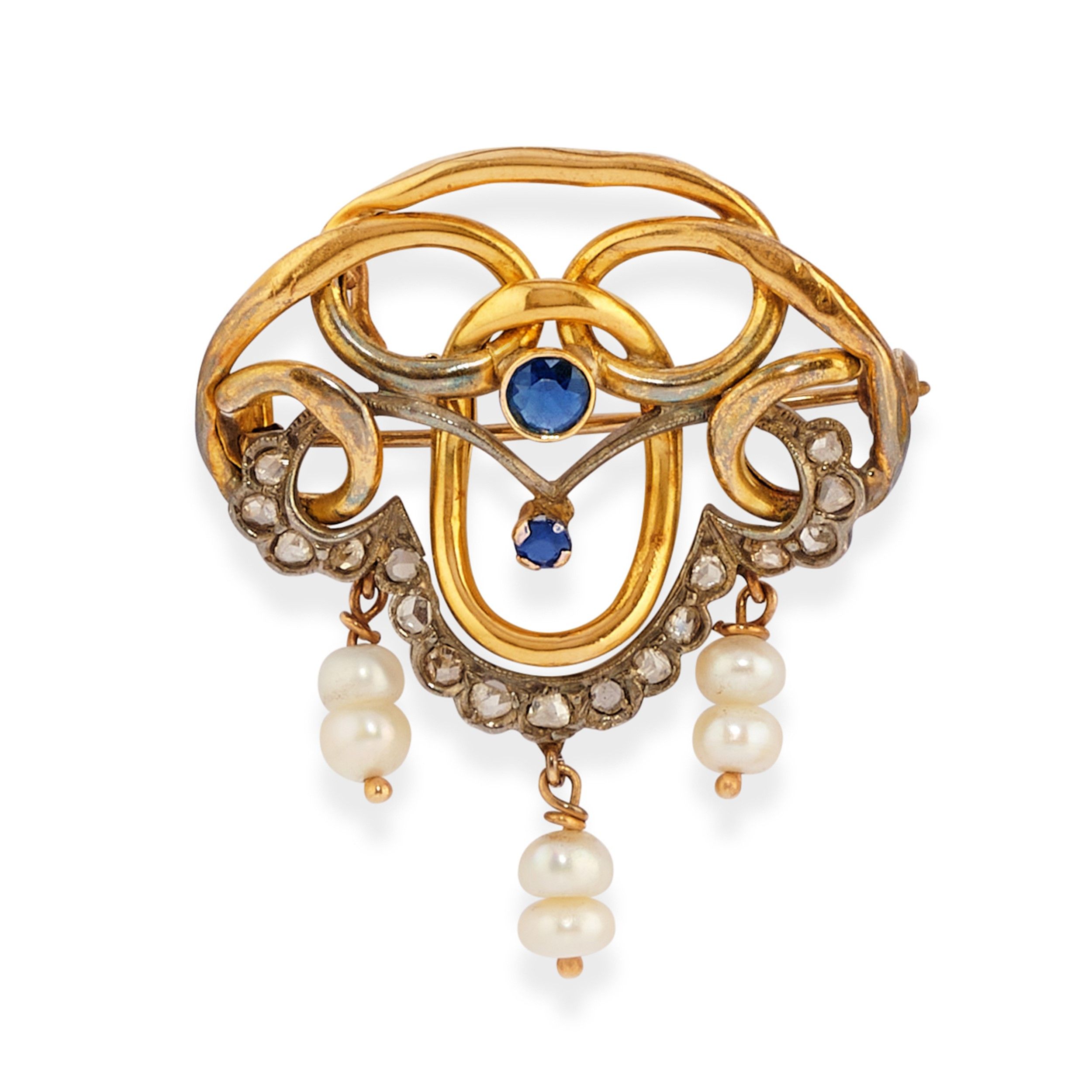 composto da quattro pendenti, una spilla, una coppia di orecchini e un fermasoldi, di varie forme e raffigurazioni, con decori in diamanti, perle e pietre di colore.