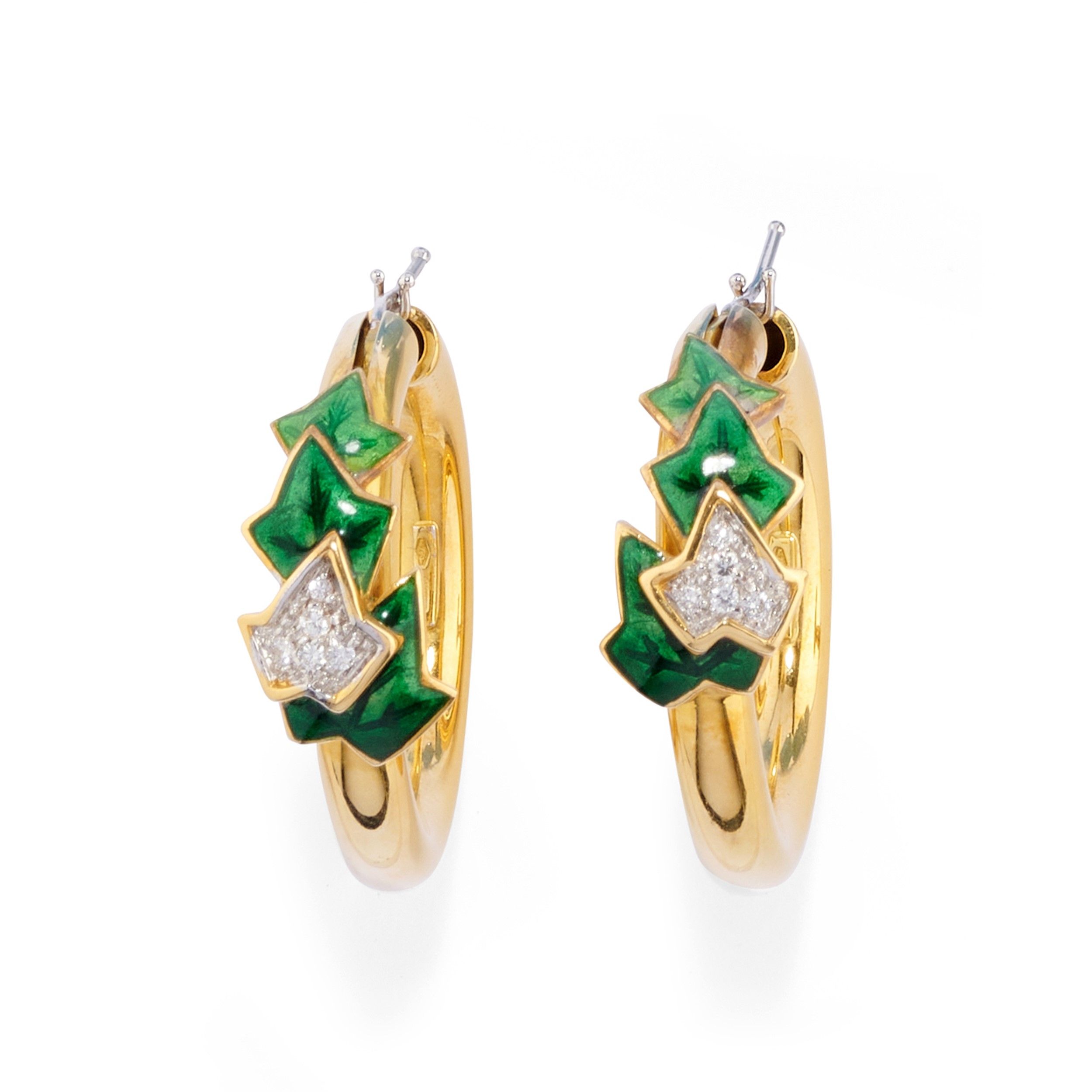 a cerchio, con foglie in smalto verde e diamanti taglio brillante, chiusura con perno.