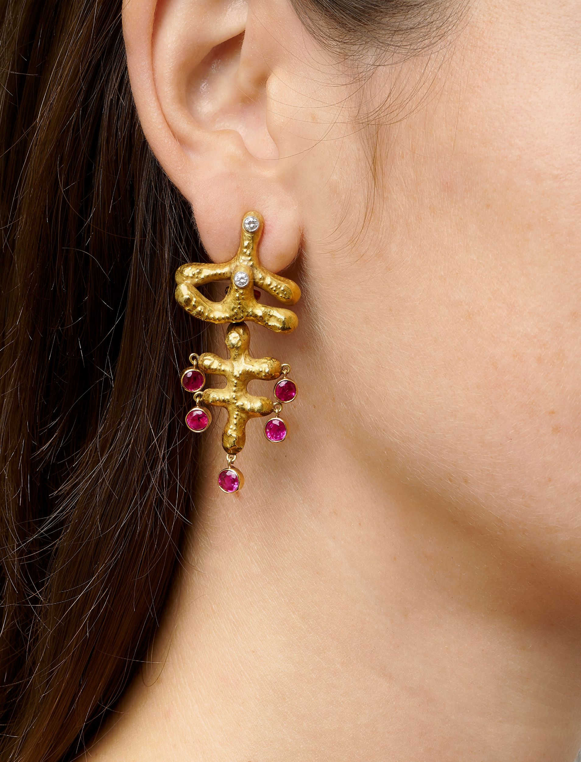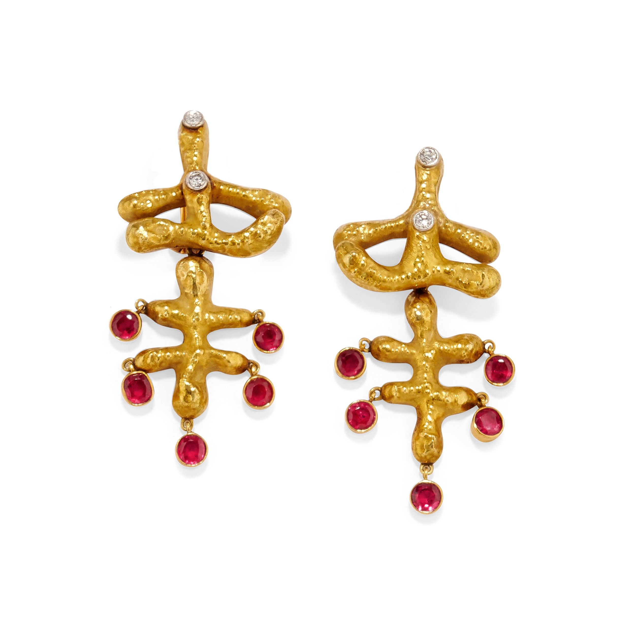 stilizzati in oro martellato con rubini taglio rotondo e diamanti taglio brillante, chiusura a clip.