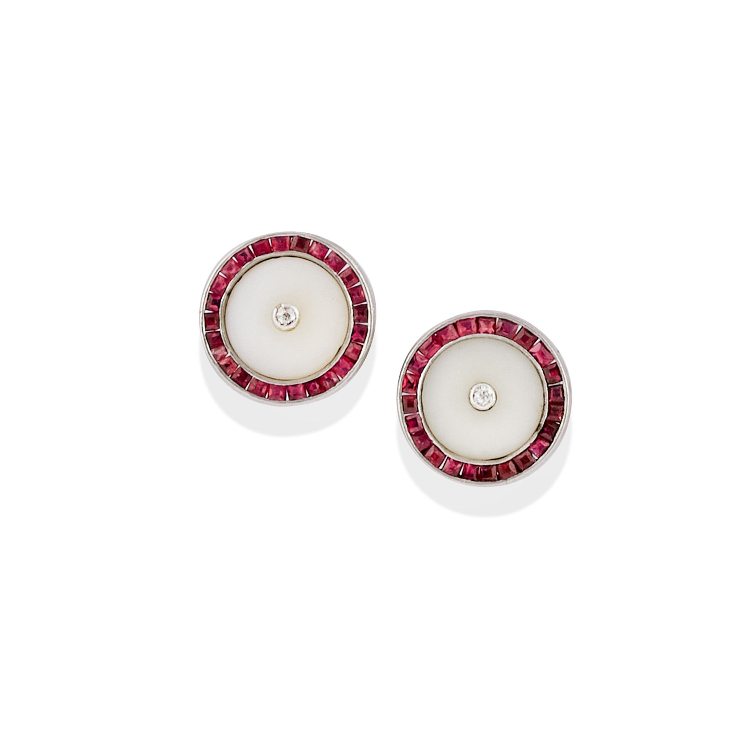 realizzati a bottone con rubini taglio carrè, diamanti taglio huit-huit su fondo in pietra dura chiara, chiusura perno e farfalla.