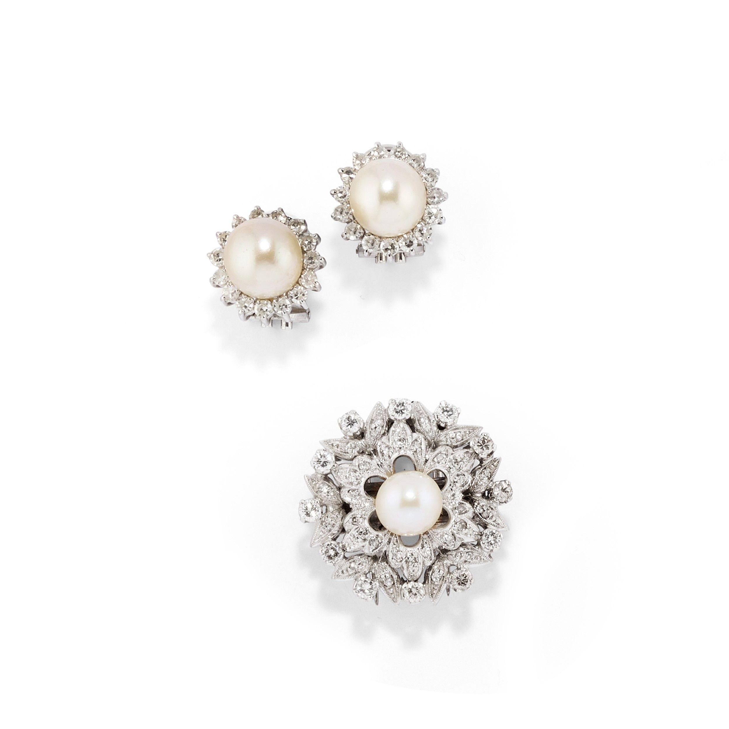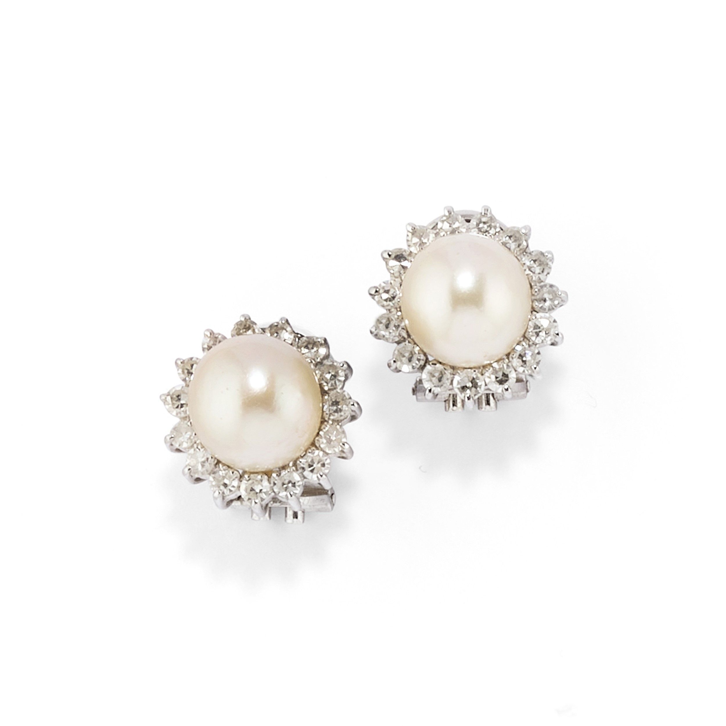al centro perle coltivate Giappone di mm 8,00-9,00 circa, diamanti taglio huit-huit e brillante per totale ct 1,50 circa, chiusura perno e clip.