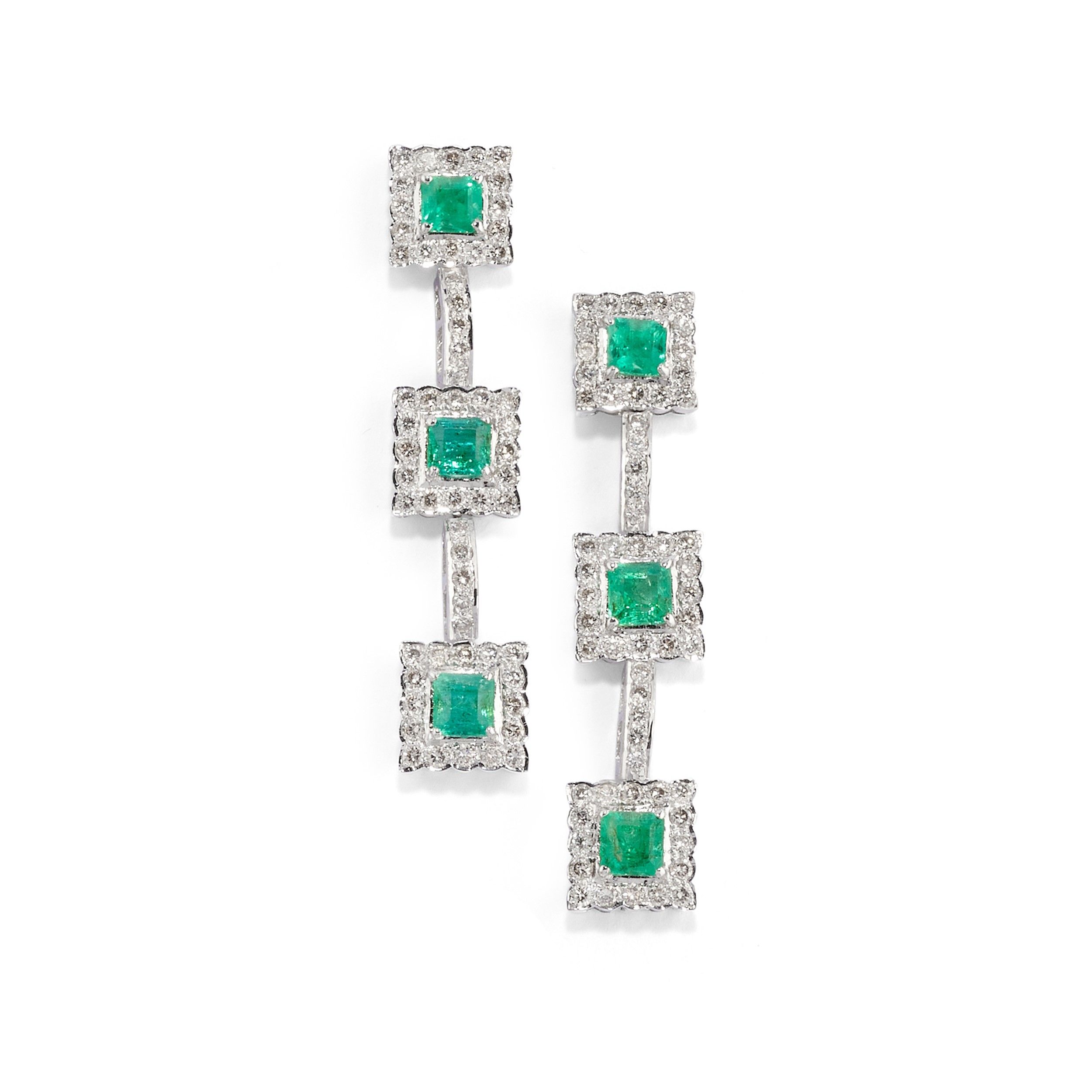 percorsi da smeraldi taglio quadrangolare a contorno ottagonale per totale ct 4,00 circa e diamanti taglio brillante per totale ct 3,00 circa, chiusura perno e farfalla.