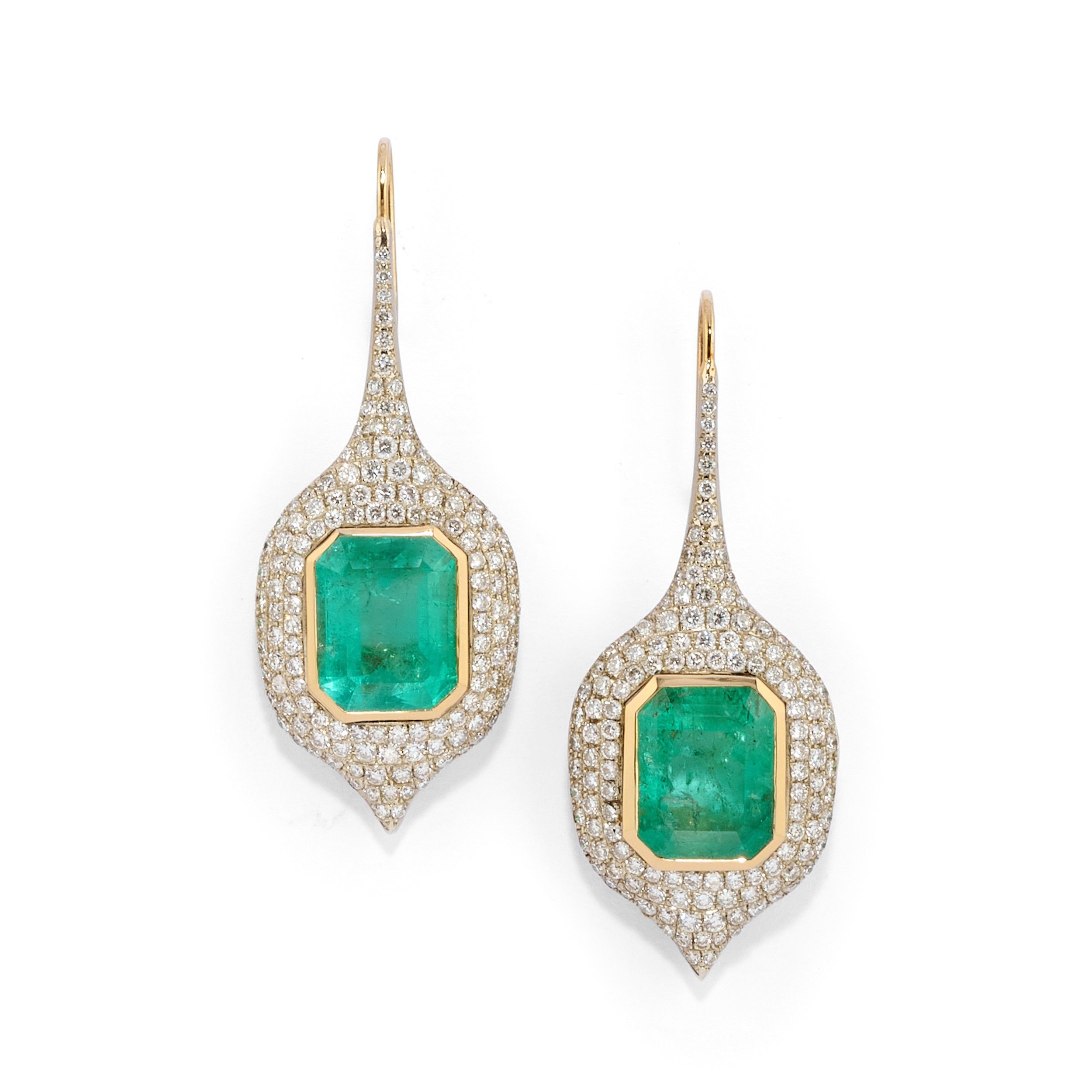 realizzati a goccia con al centro smeraldi Colombia taglio rettangolare a contorno ottagonale per totale ct 19,65 e diamanti taglio brillante a decoro per totale ct 4,00 circa, chiusura a monachella.