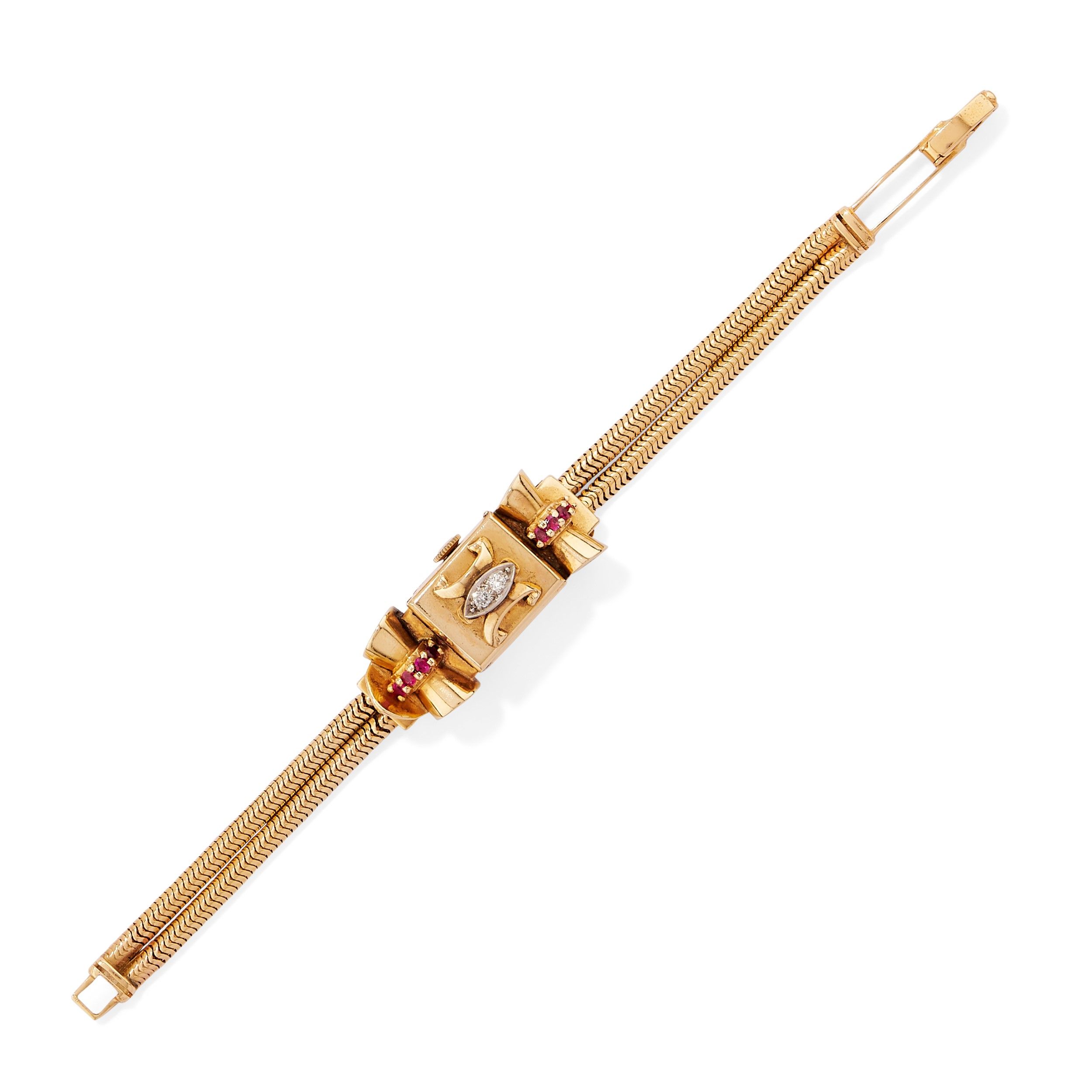 cassa rettangolare, quadrante rosa con numeri romani in smalto nero, movimento a carica manuale, copri cassa e anse decorate da diamanti taglio brillante e rubini taglio rotondo.