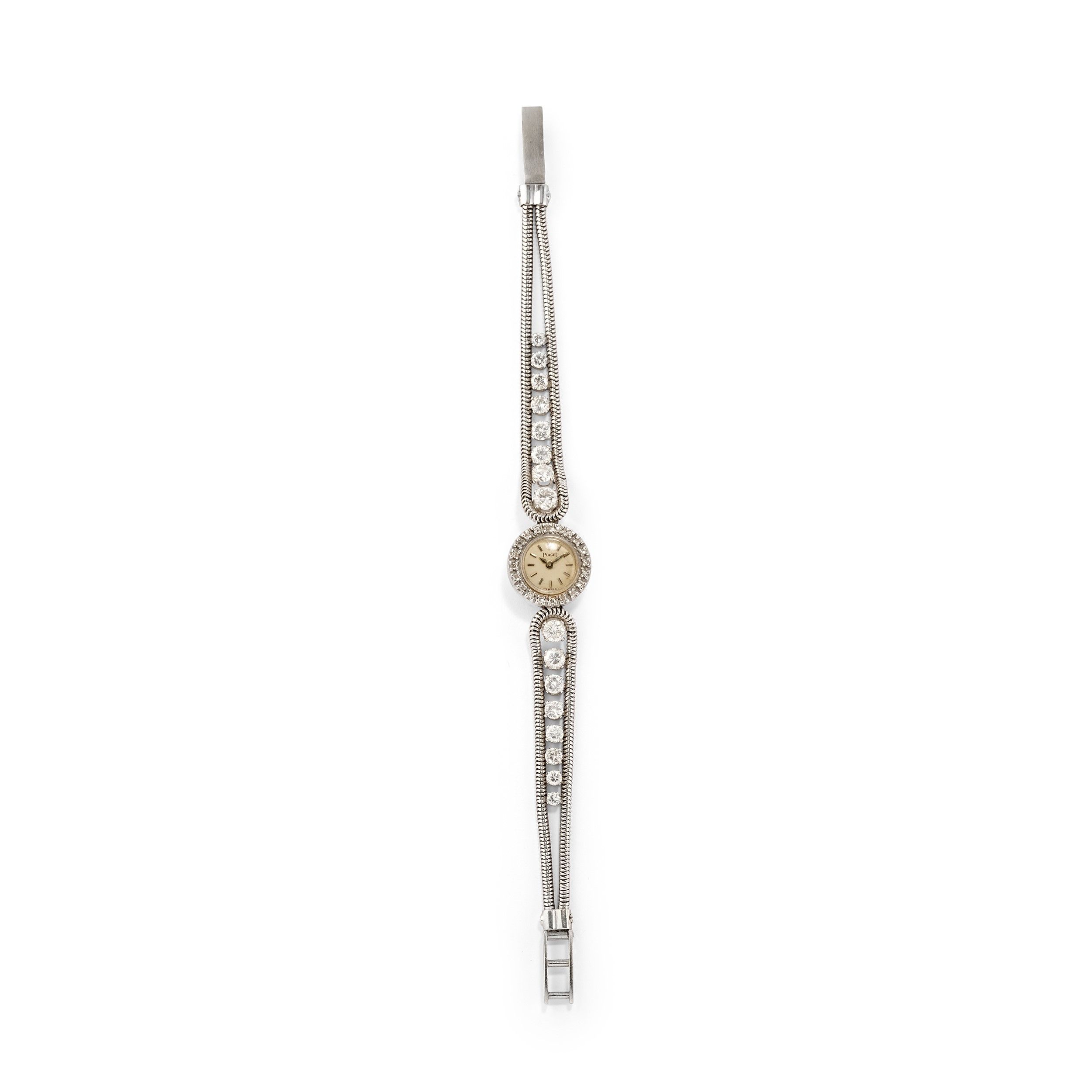 cassa rotonda, quadrante chiaro con indici applicati, movimento a carica manuale, lunetta in diamanti taglio huit-huit, bracciale a queue de rat con diamanti taglio brillante per totale ct 2,50 circa.