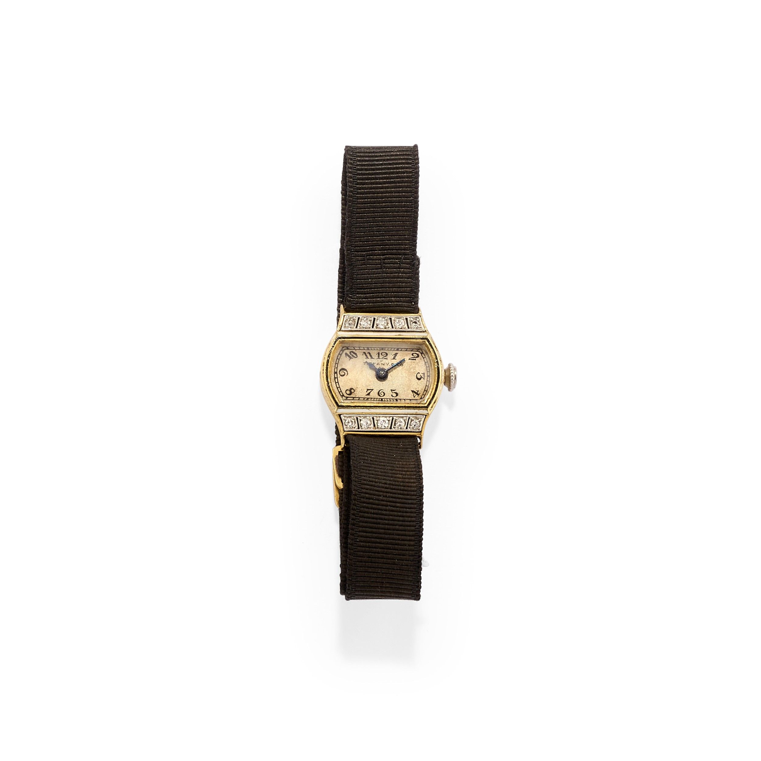 cassa a cuscino, quadrante chiaro con numeri arabi in smalto nero, movimento a carica manuale, contorno in smalto e decoro in diamanti taglio huit-huit, difetti (non funzionante).