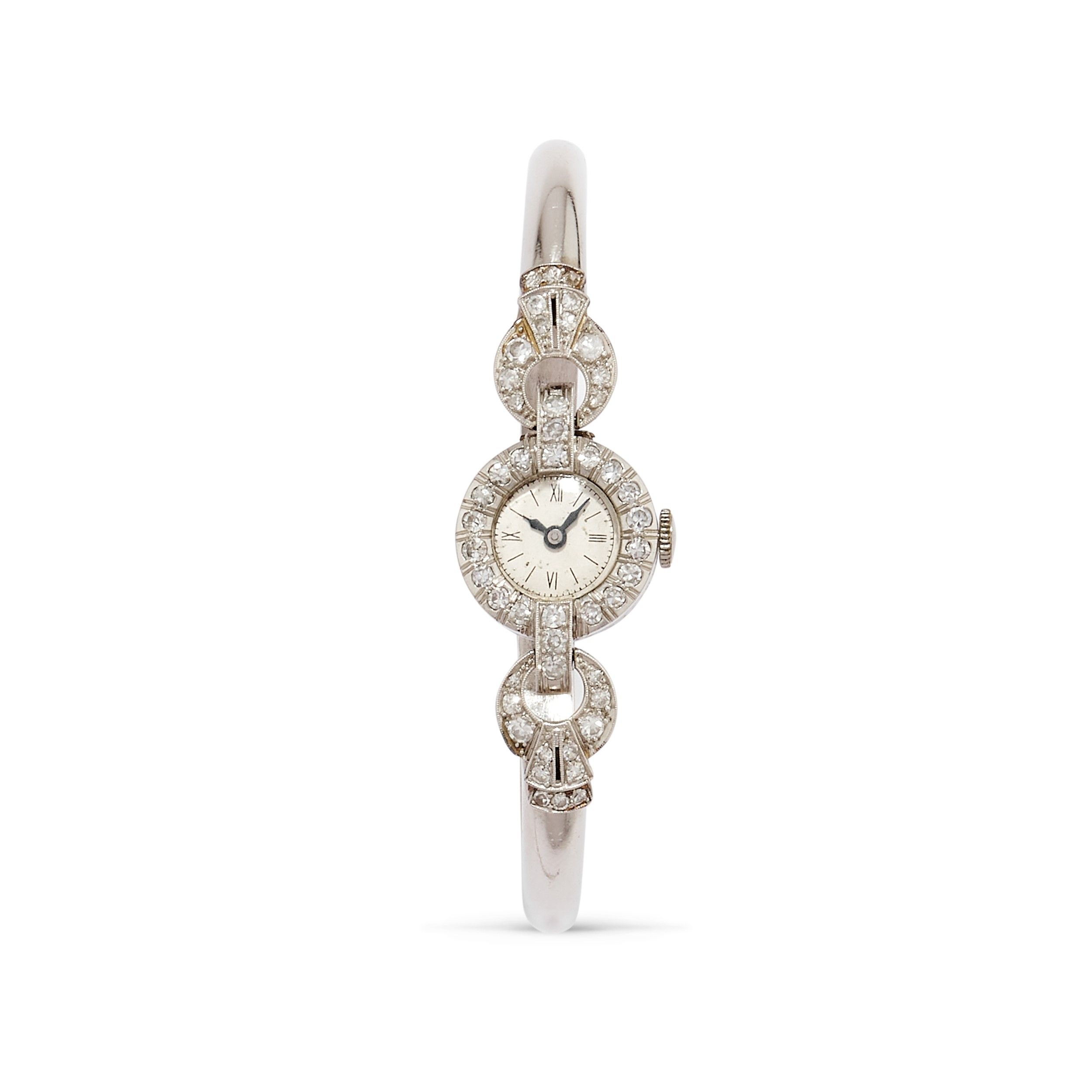 cassa rotonda, quadrante bianco con numeri romani in smalto nero, movimento a carica manuale, decorato da diamanti taglio huit-huit per totale ct 1,00 circa.