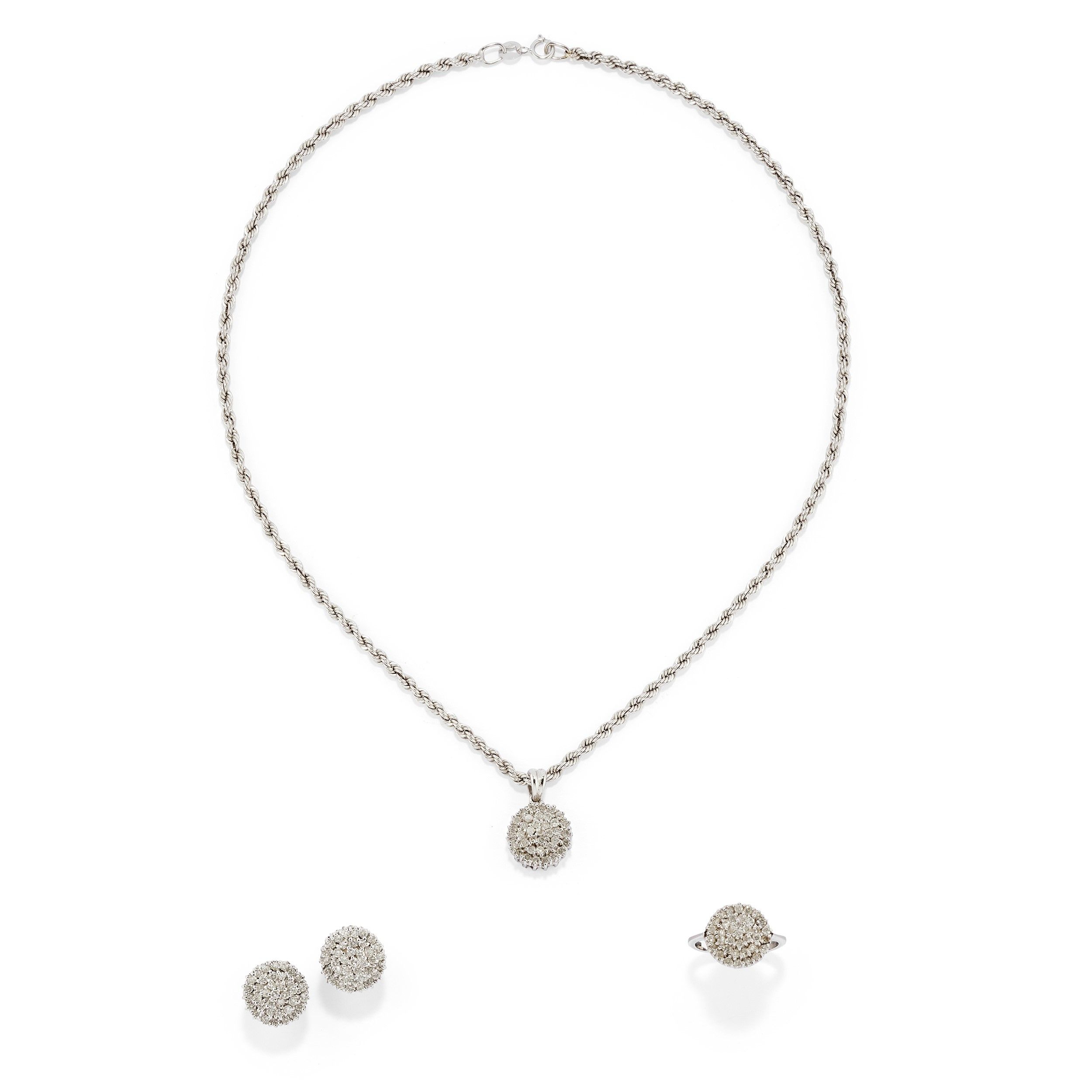 composta da collana, anello e coppia di orecchini con chiusura a clip interamente impreziositi da diamanti taglio brillante per totale ct 3,00 circa.
