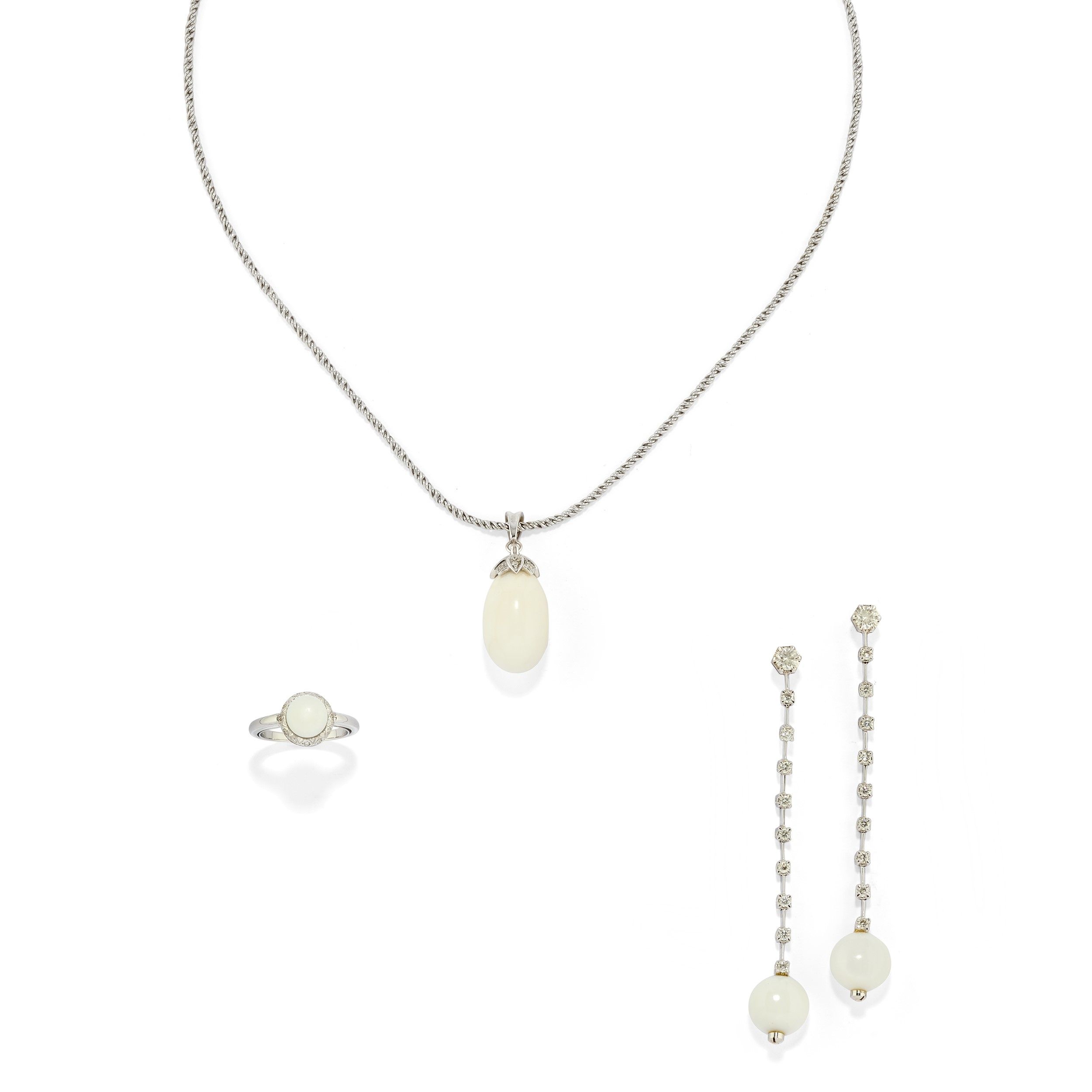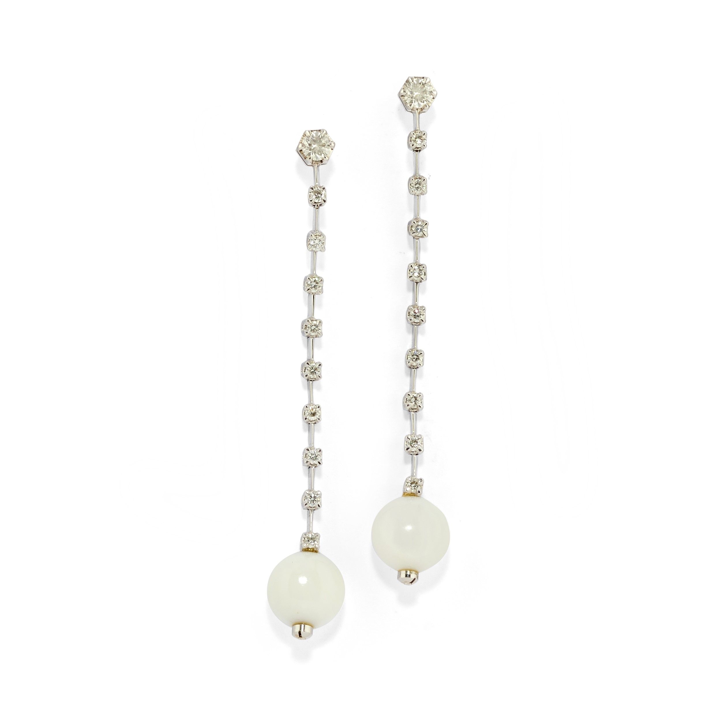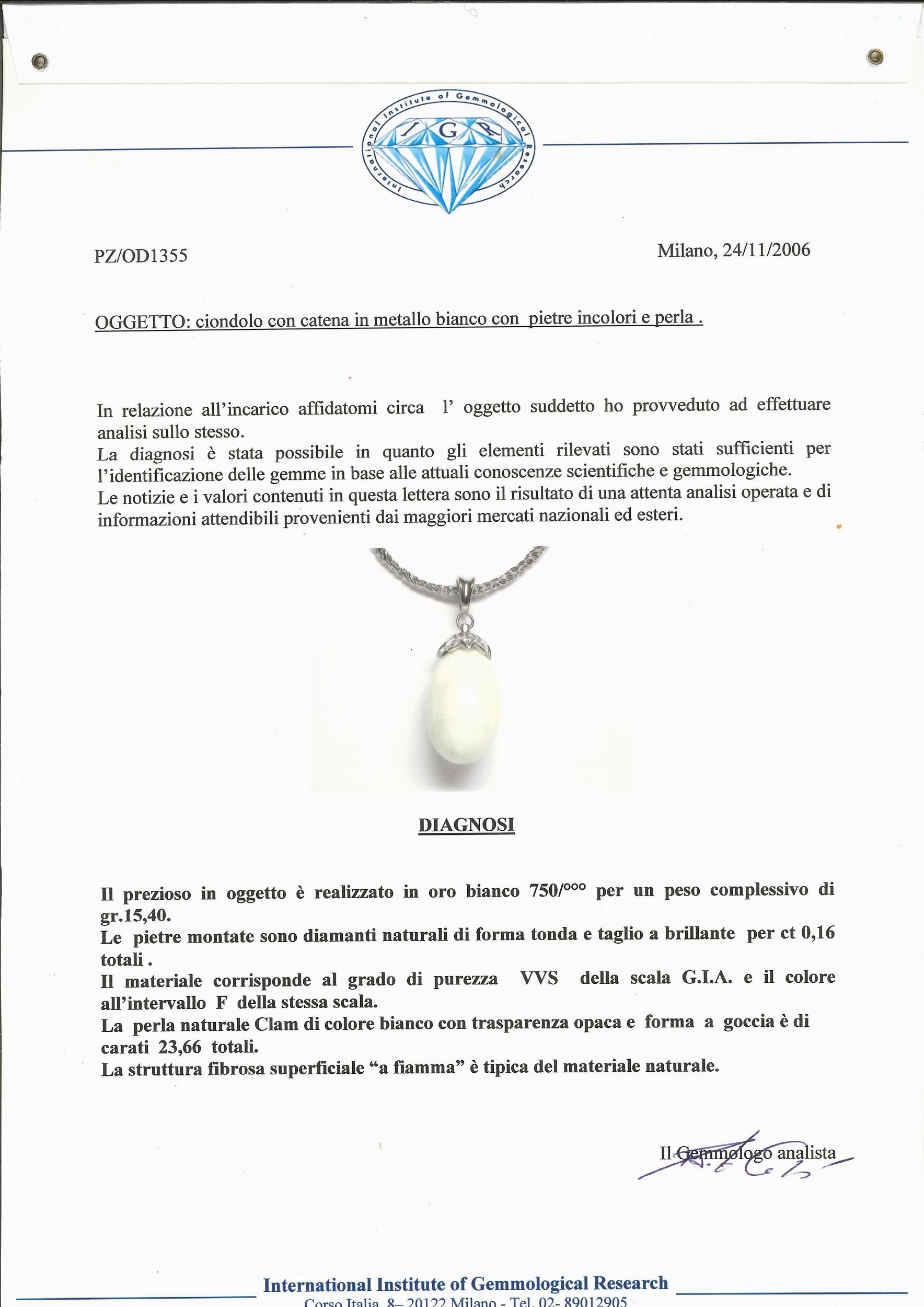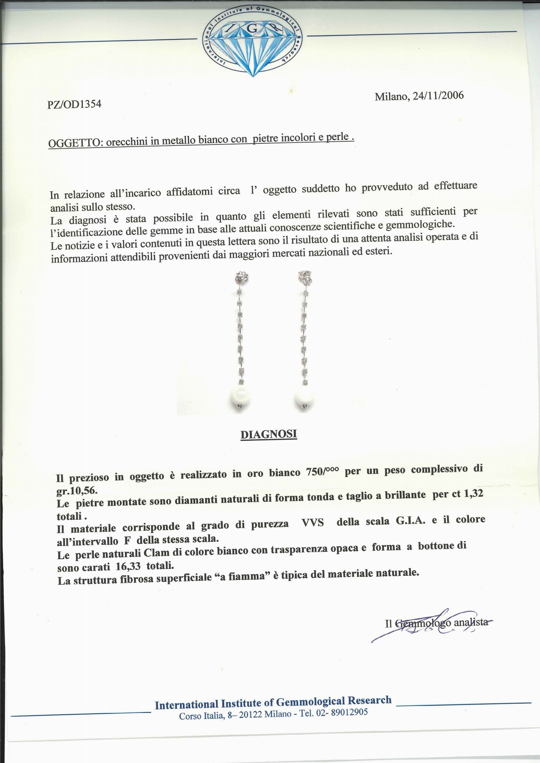 composta da anello, coppia di orecchini pendenti con chiusura perno e farfalla e pendente trattenuto da collana, con perle naturali Clam di colore bianco, forma a bottone e goccia per totale ct 43,07, diamanti taglio brillante per totale ct 1,48 colore F, purezza VVS.