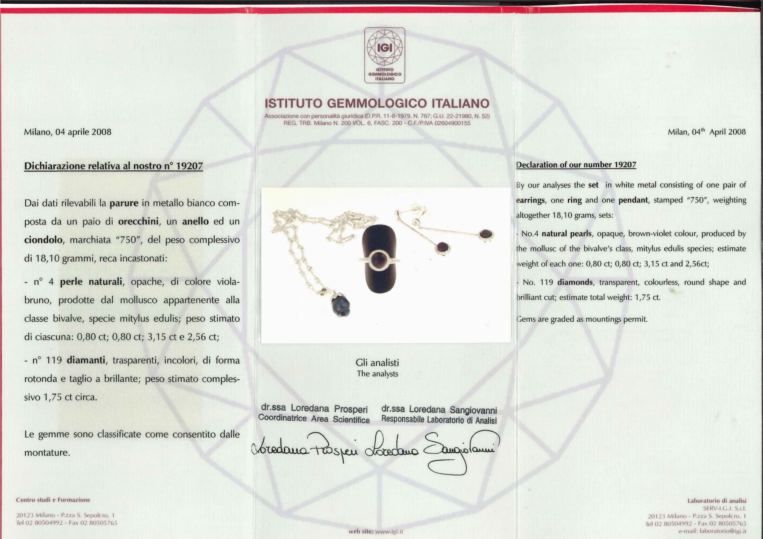 composta da anello, coppia di orecchini pendenti con chiusura perno e farfalla e pendente trattenuto da collana, con quattro perle naturali color viola-bruno, forma rotonda e barocca di ct 7,31 circa e diamanti taglio brillante per totale ct 1,75 circa.