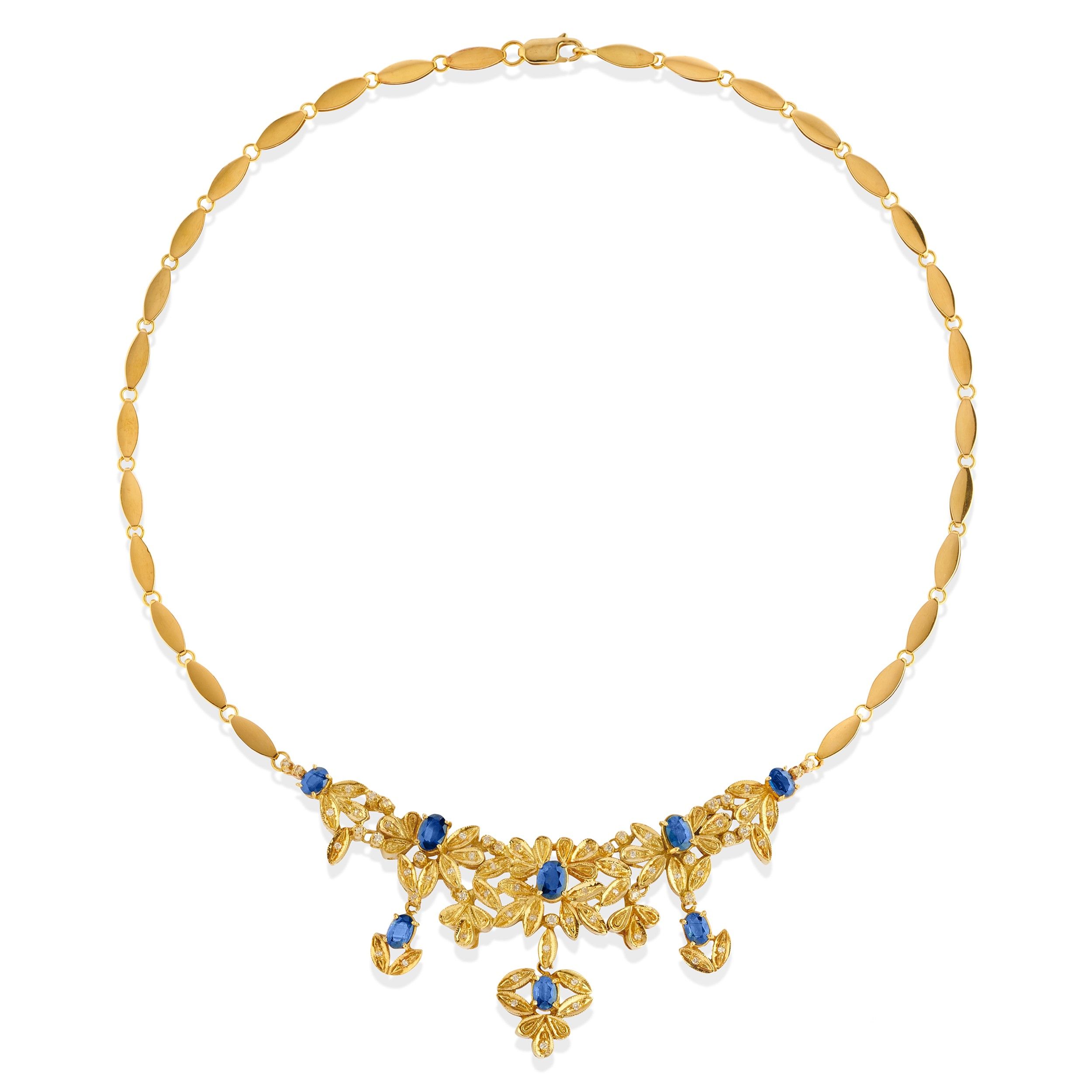composta da collana, anello e coppia di orecchini pendenti con chiusura perno e clip, zaffiri taglio ovale per totale ct 8,00 circa, diamanti taglio huit-huit a decoro.