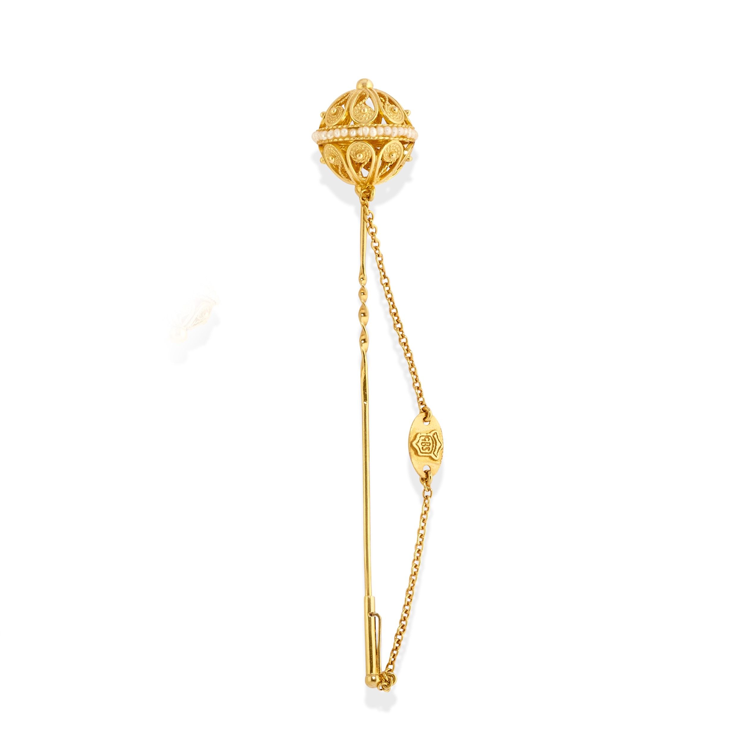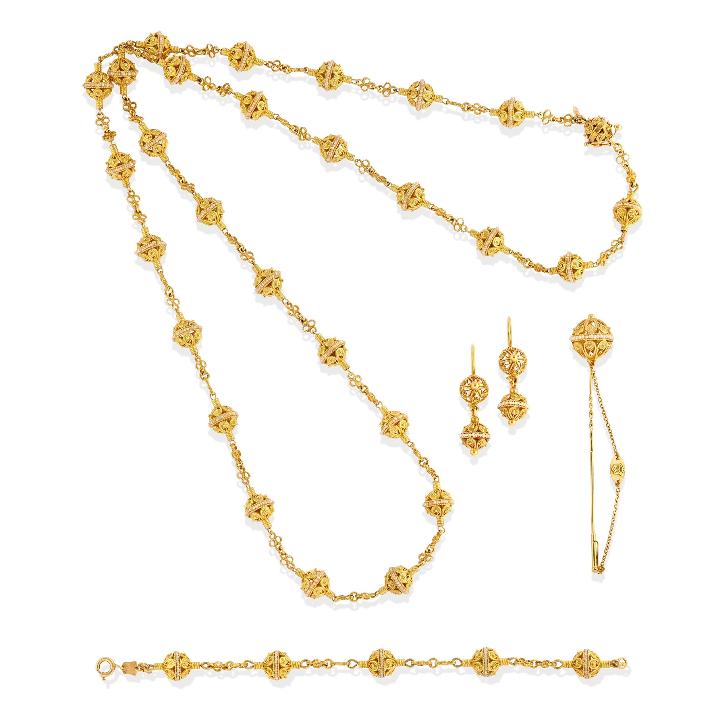 composta da collana sautoire, bracciale, coppia di orecchini e spillone, con motivi a boules traforati e decorati con perline, chiusura a monachella.