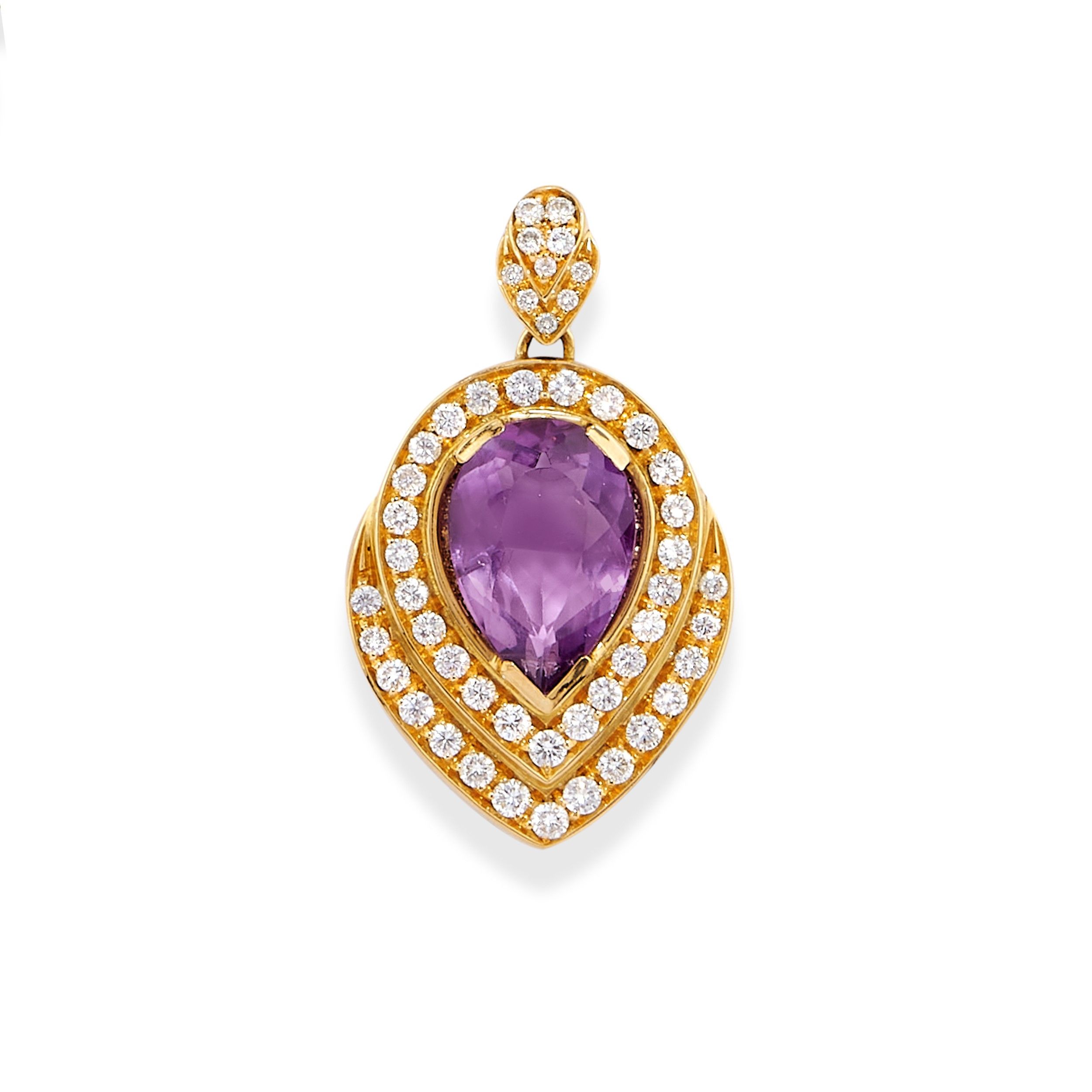 al centro ametista taglio goccia di ct 9,00 circa, contorno in diamanti taglio brillante per totale ct 2,00 circa.