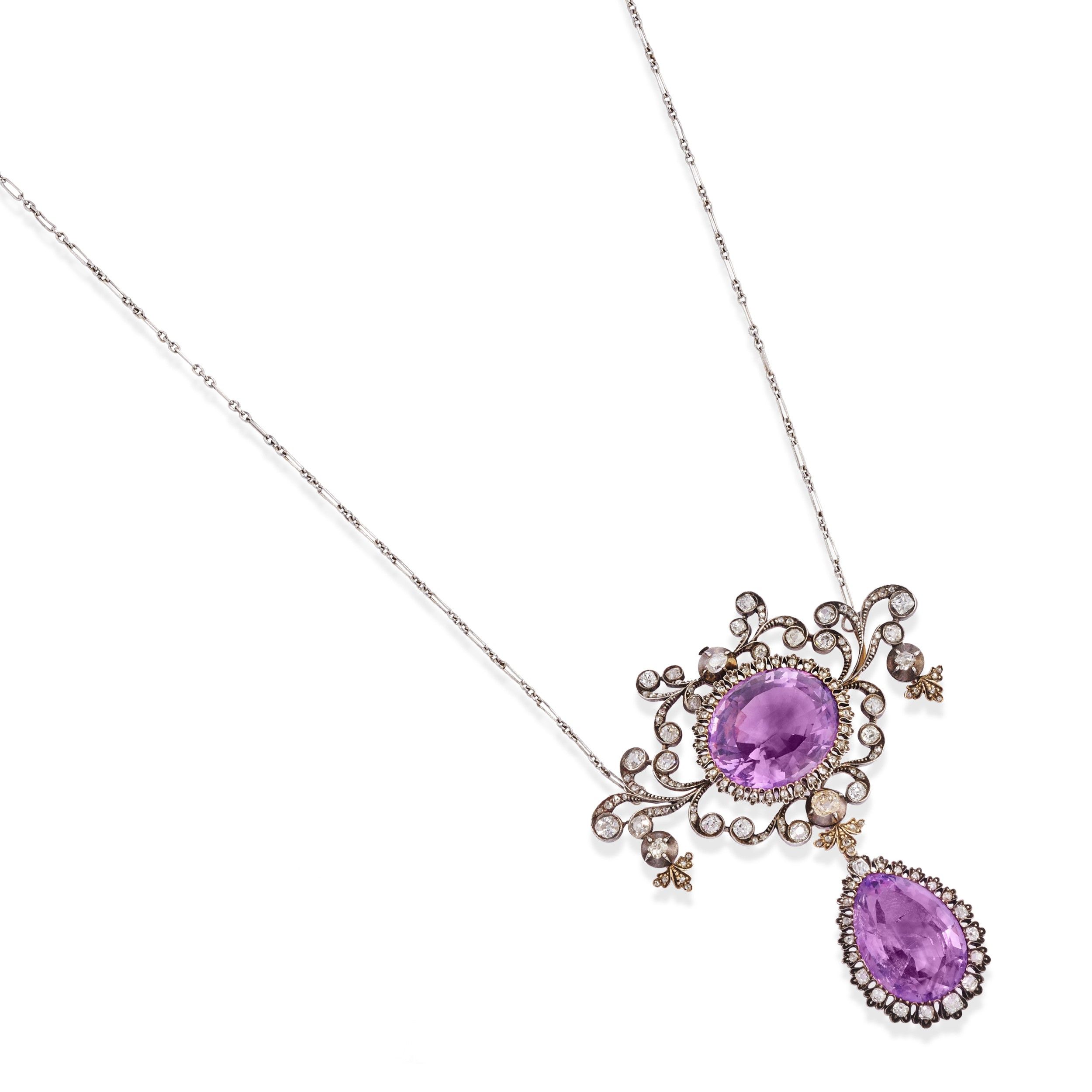 XIX Secolo realizzato a doppio corpo con eleganti volute in diamanti taglio rosa e vecchio, ametiste taglio ovale e goccia, trattenuto da collanina.