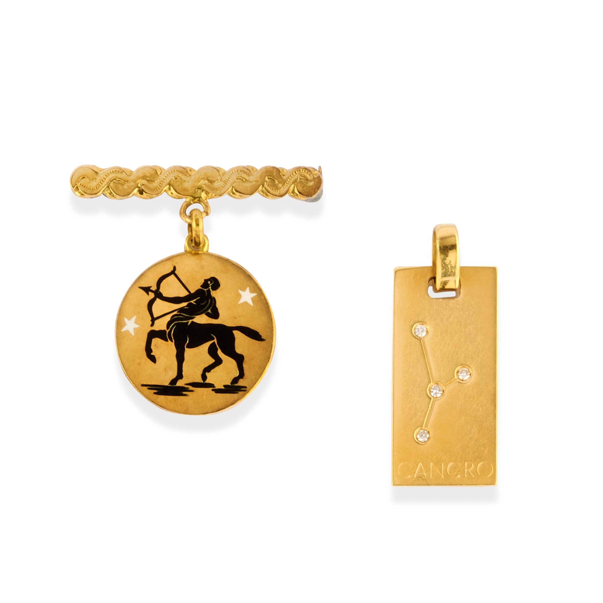spilla con pendente raffigurante segno zodiacale del sagittario in smalto nero e bianco e pendente con scritta cancro , impreziosito da quattro diamanti taglio huit-huit.