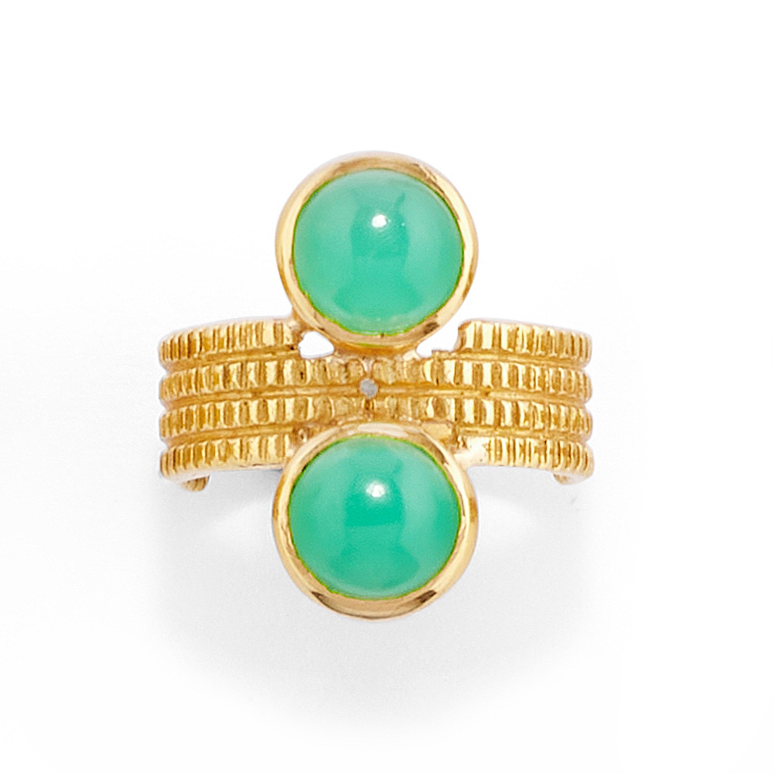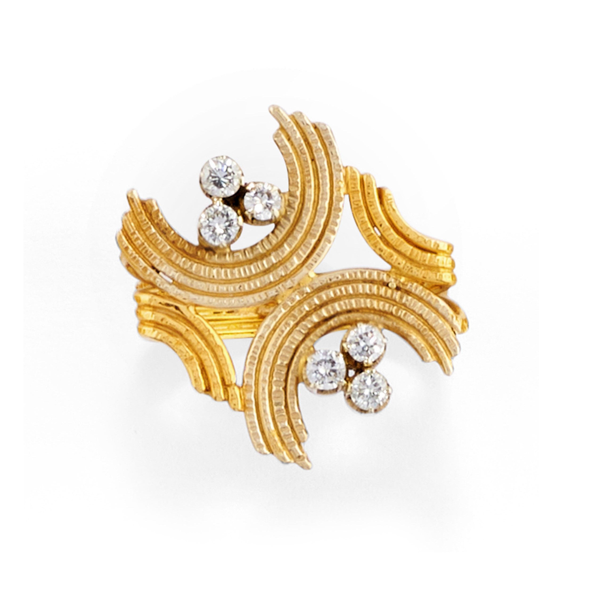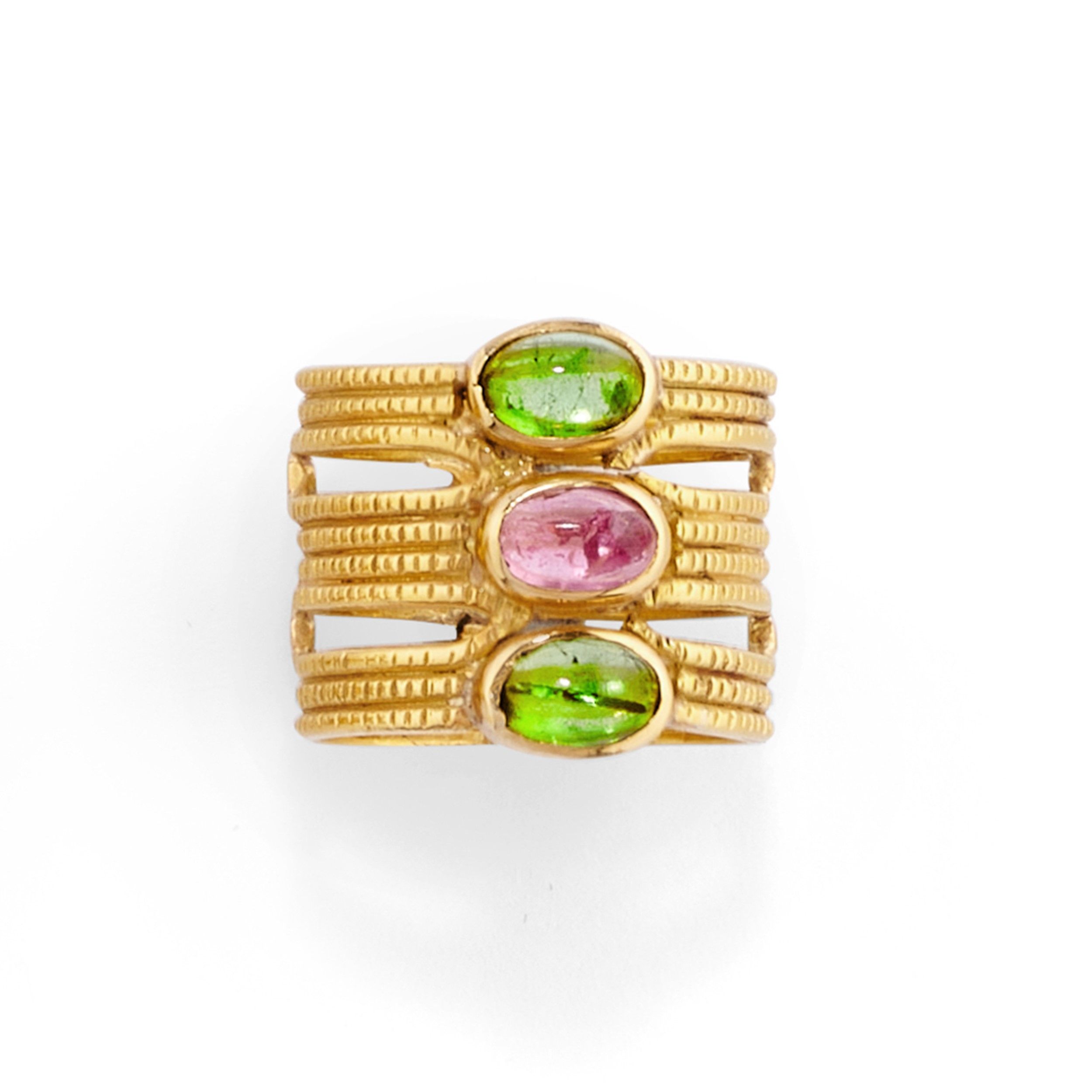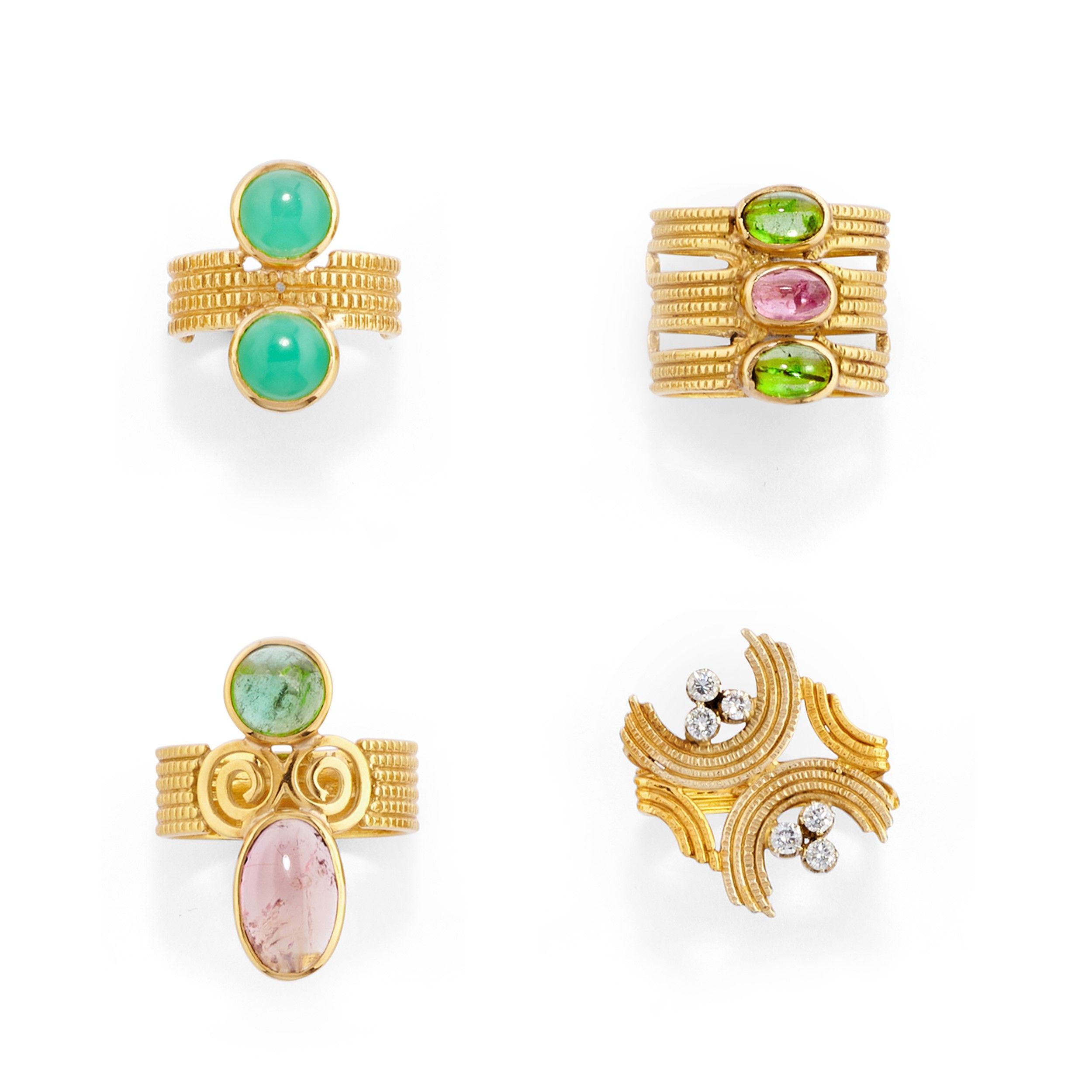 montature realizzate in filo d'oro martellato con diamanti taglio brillante e pietre di colore taglio rotondo e ovale cabochon (prob. tormaline e crisoprasio).