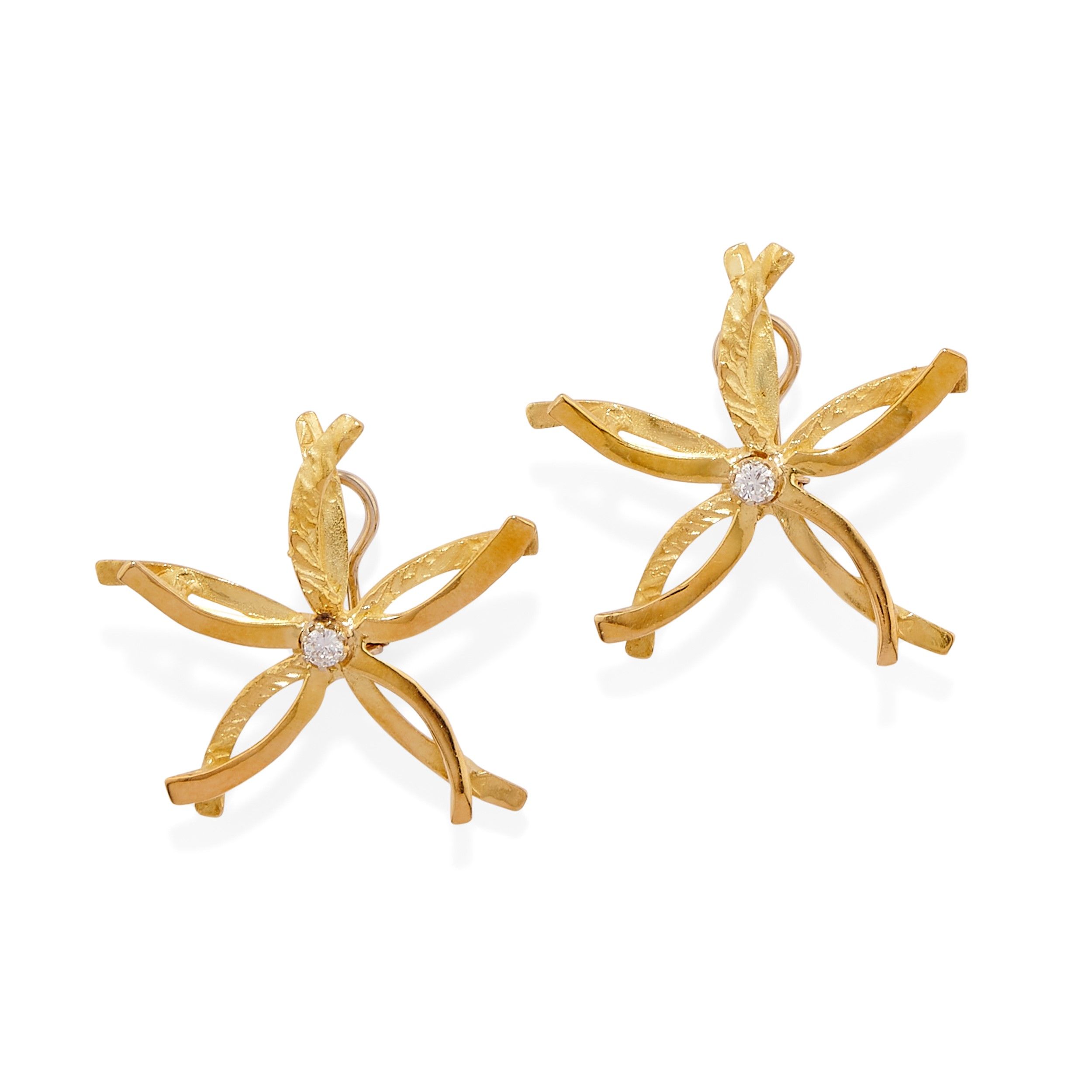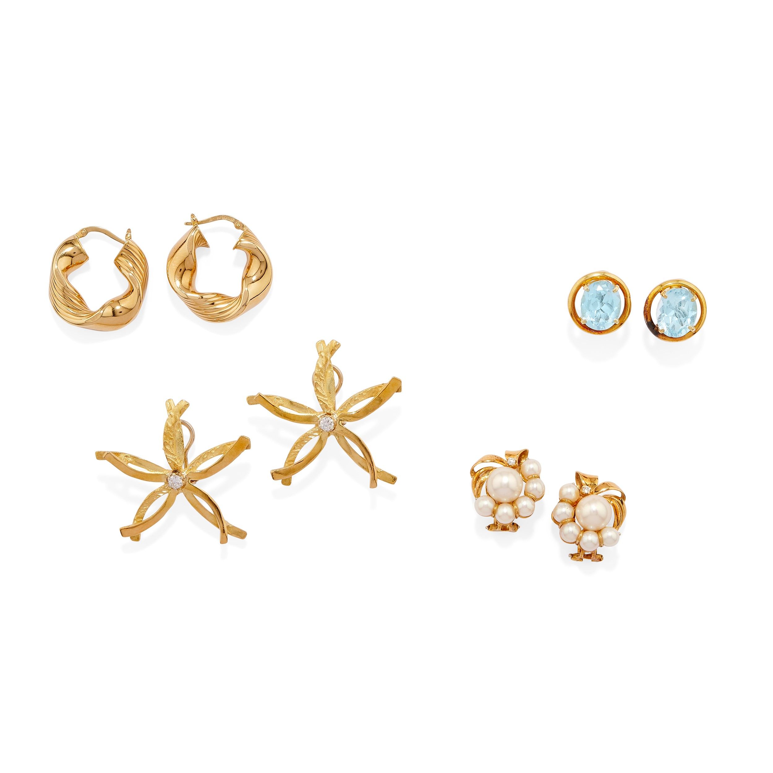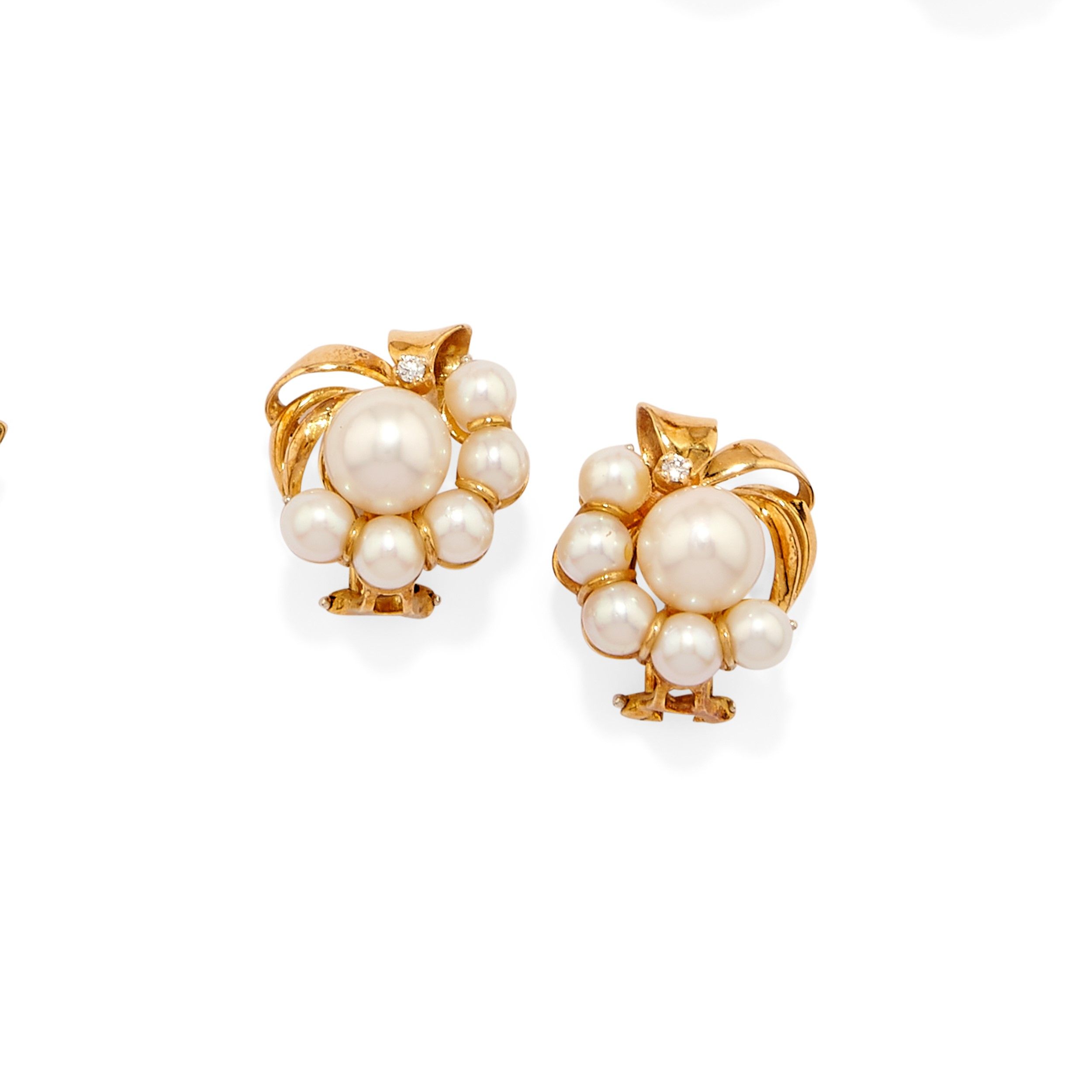 una a cerchio, una con perle coltivate, una con topazio taglio ovale ed una a fiore con al centro diamanti taglio brillante per totale ct 0,30 circa, chiusure a perno e perno e clip.