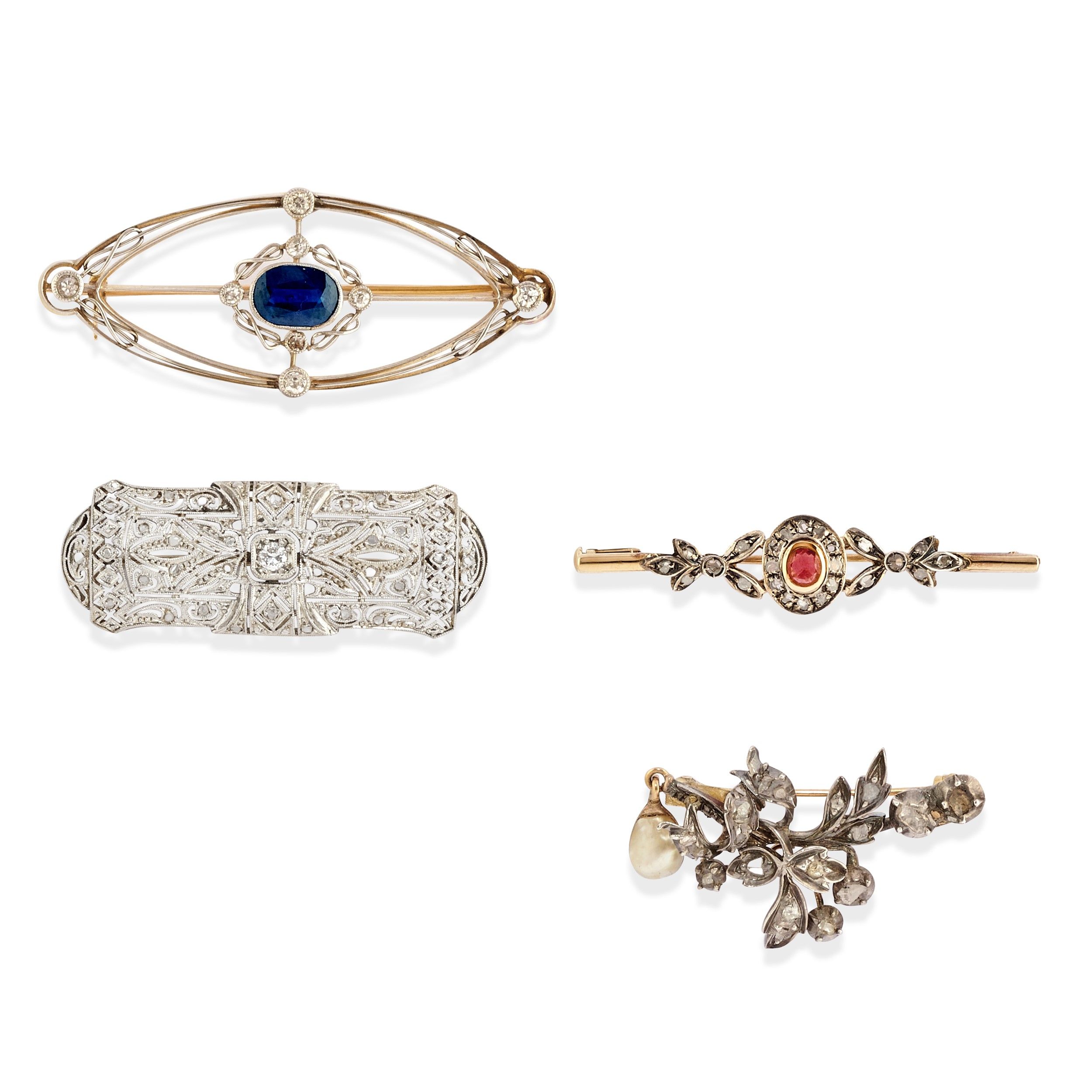 di varie forme e raffigurazioni, con diamanti, zaffiro, rubino e perla.