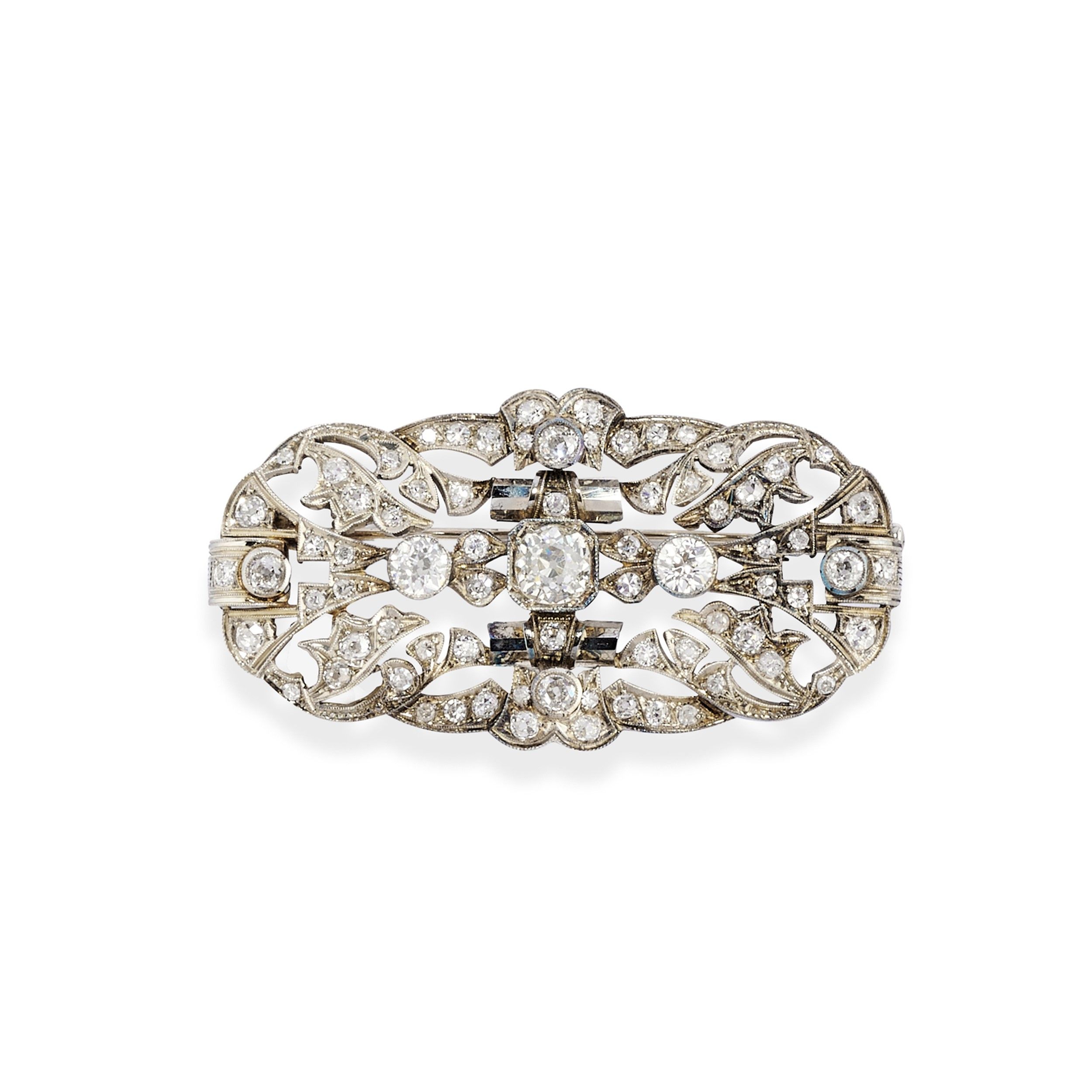 1930 circa a saponetta, interamente traforata e impreziosita da diamanti taglio vecchio e huit-huit per totale ct 2,50 circa.