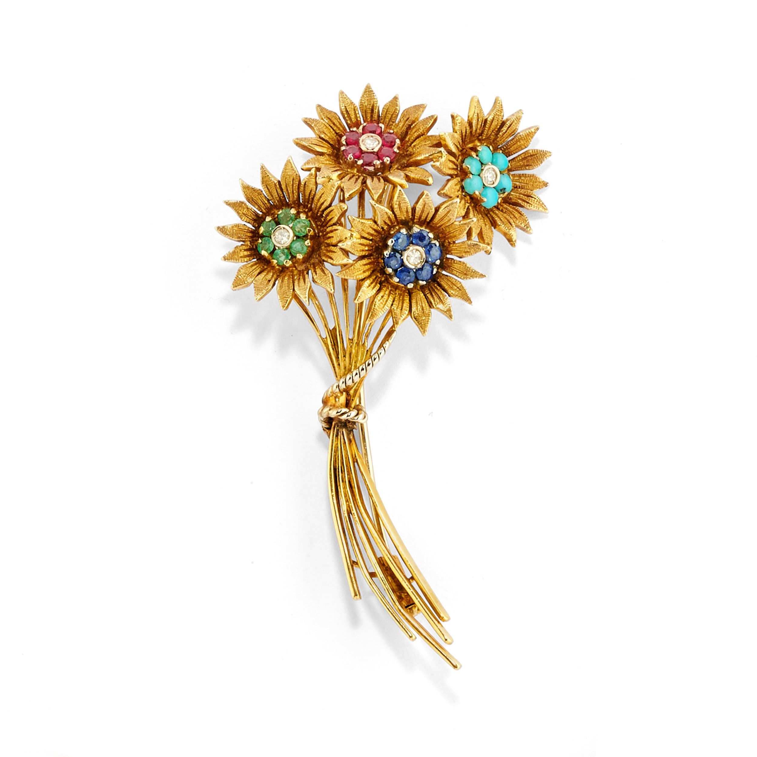 con rubini, zaffiri, smeraldi e turchesi taglio rotondo e diamanti taglio huit-huit.