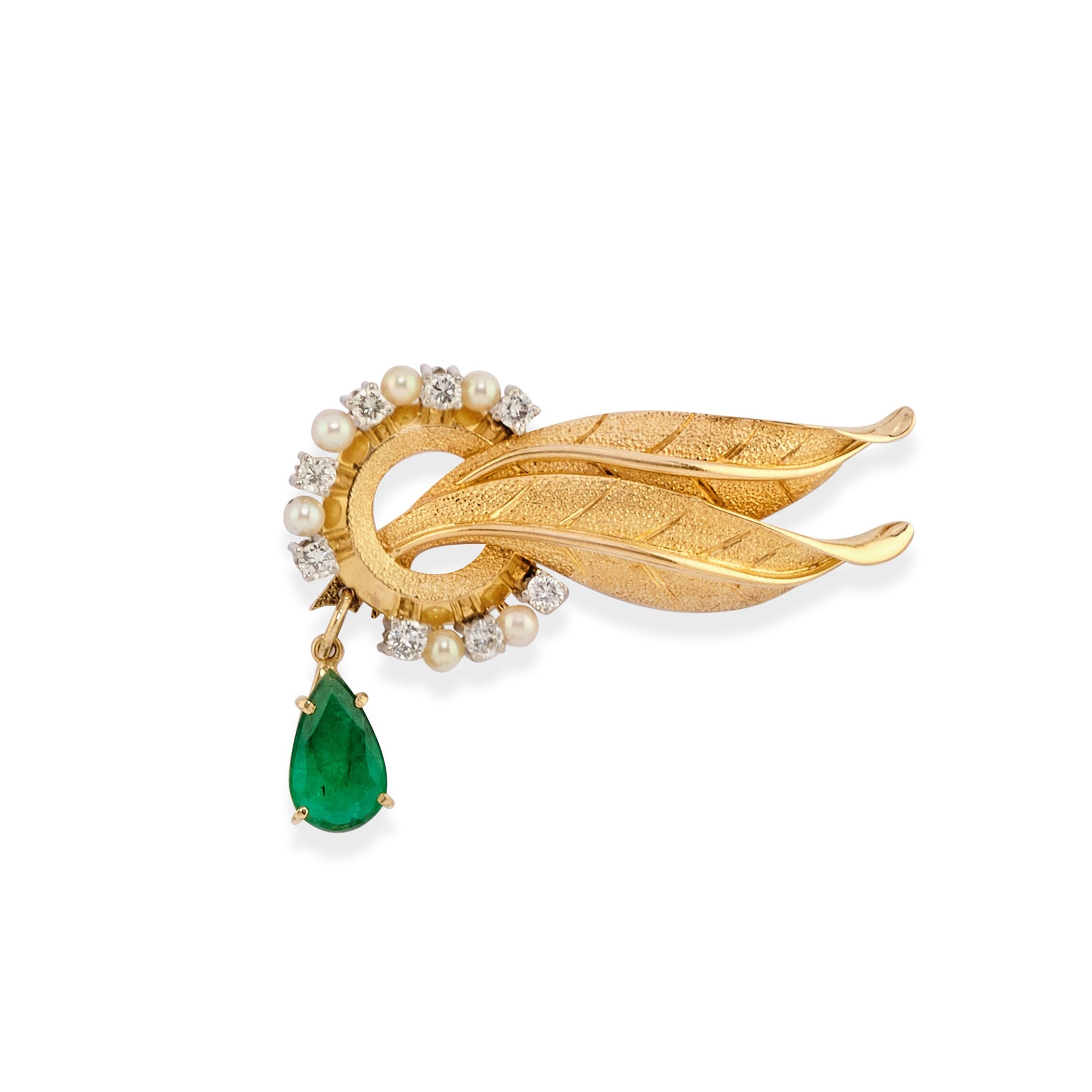 a foglie, micro perle e diamanti taglio brillante, smeraldo taglio goccia su perno oscillante.