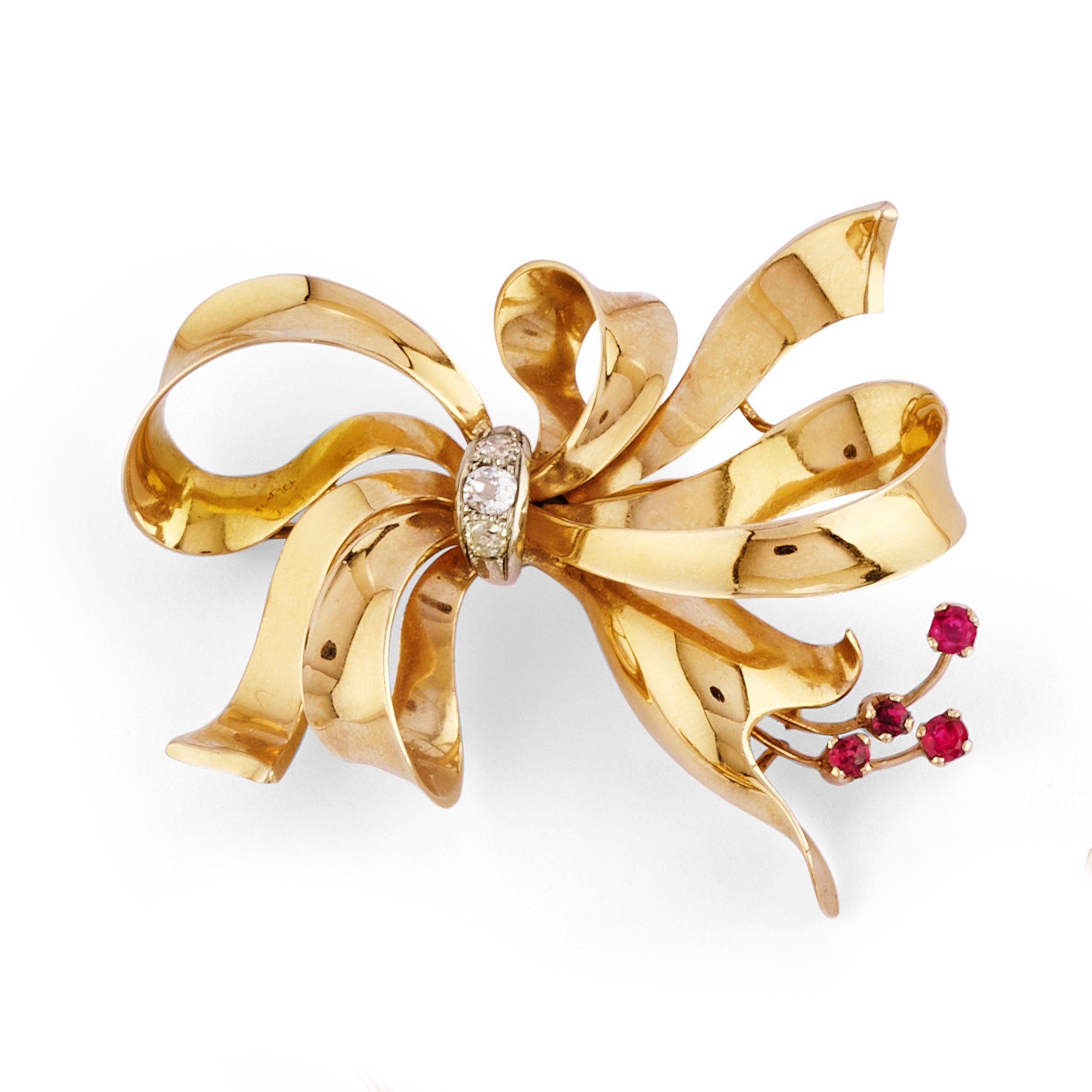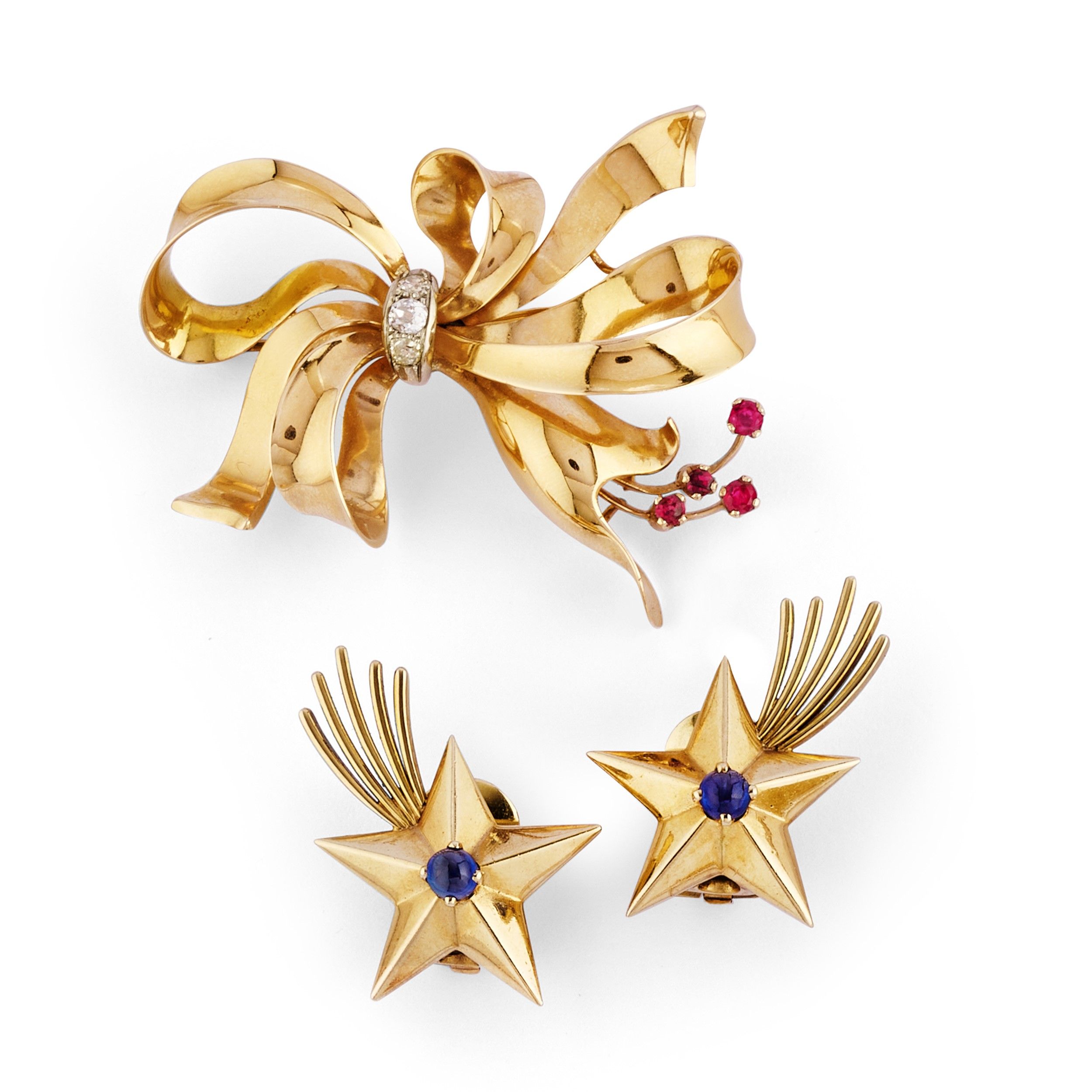 spilla a fiocco nastrato con diamanti taglio vecchio e rubini taglio rotondo, coppia di orecchini a stella cometa con zaffiri taglio rotondo cabochon, chiusura a clip.