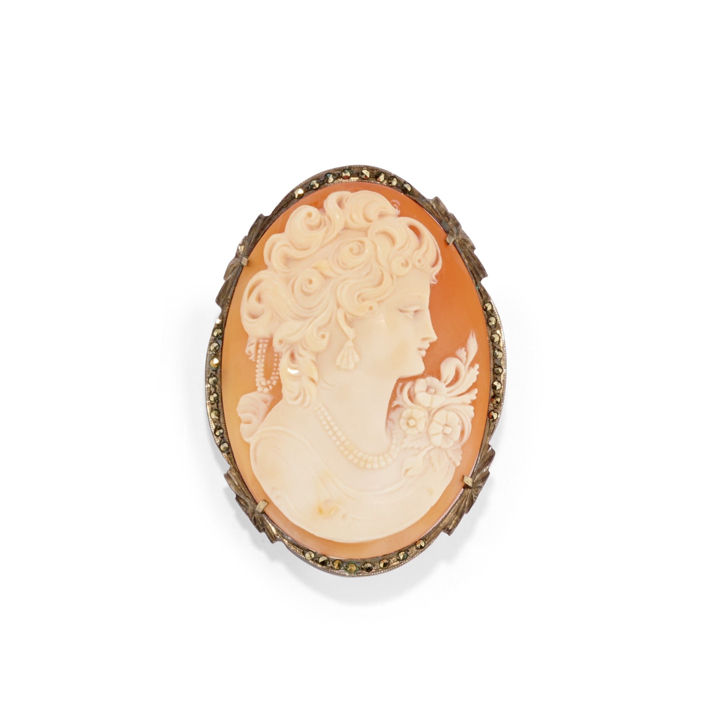 realizzati su conchiglia raffiguranti profilo femminile, orecchino con perla coltivata barocca, piccolo diamante taglio brillante e chiusura a monachella.