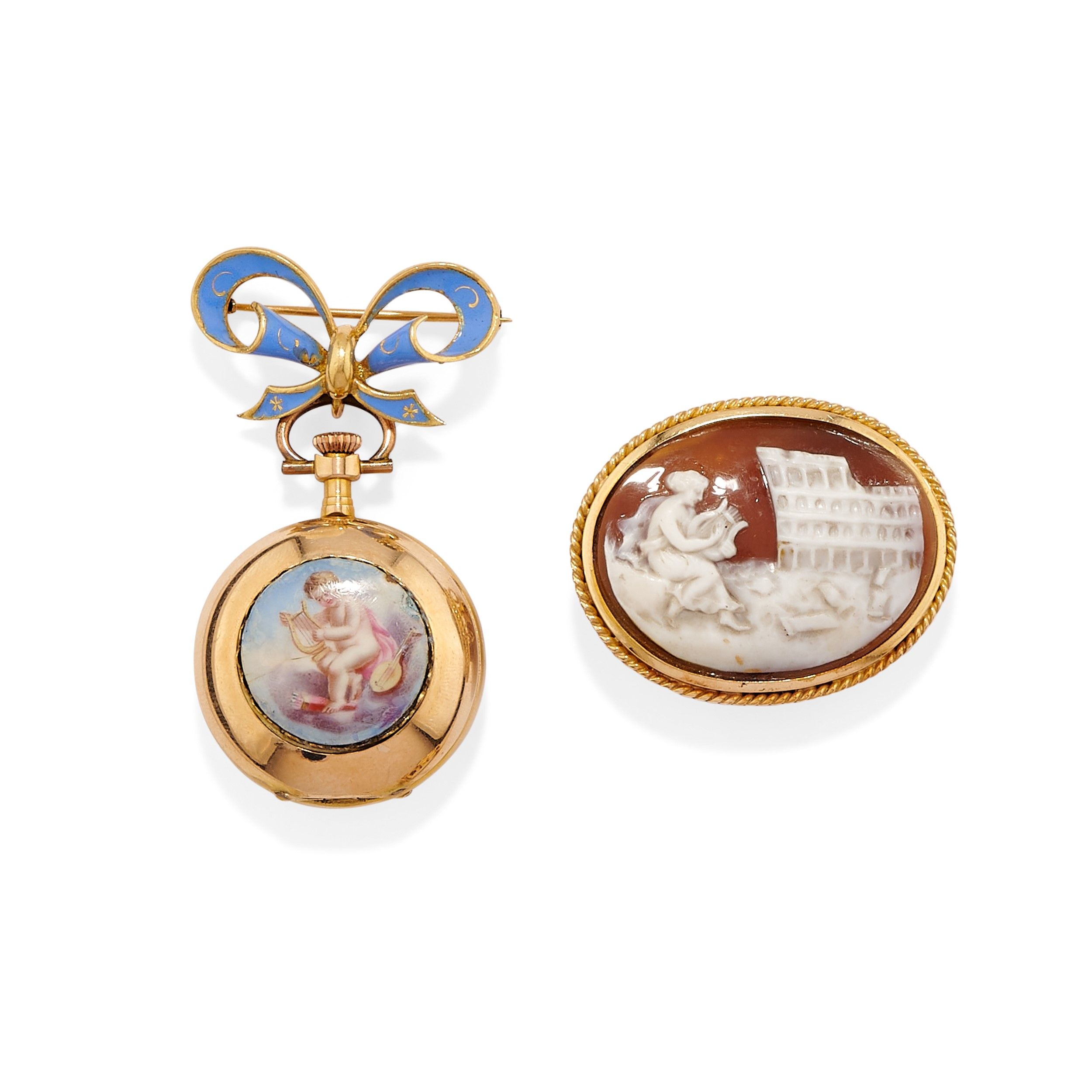 spilla con cammeo lavorato ad alto rilievo e spilla orologio decorata in smalto, difetti (visibili mancanze di smalto e lievi ammaccature sull'orologio).